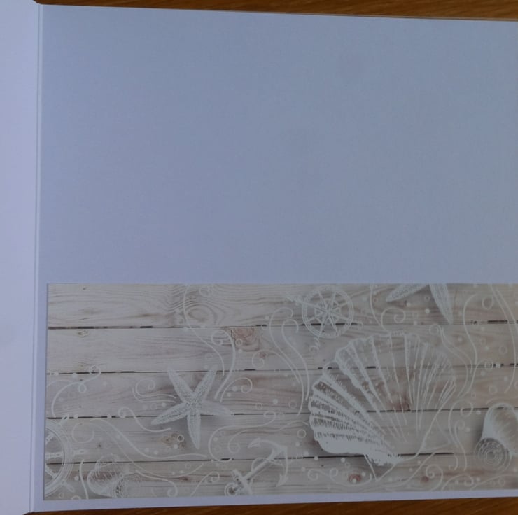 A background of whitewashed wood effect card with a white swirl pattern has a band of pastel beach huts across the centre. The background card has images of swirls, shells, starfish and a ships wheel.