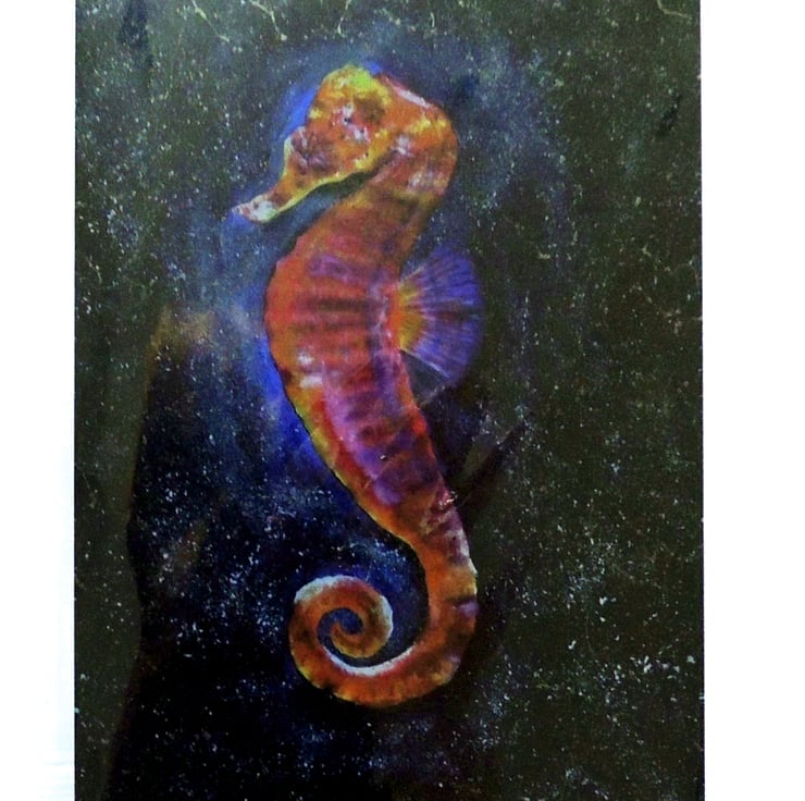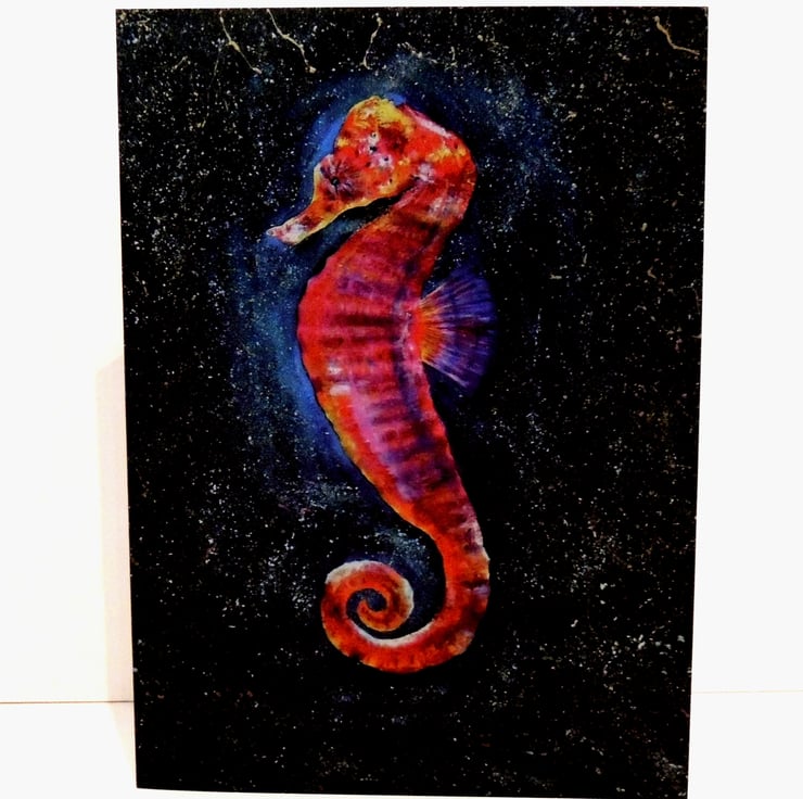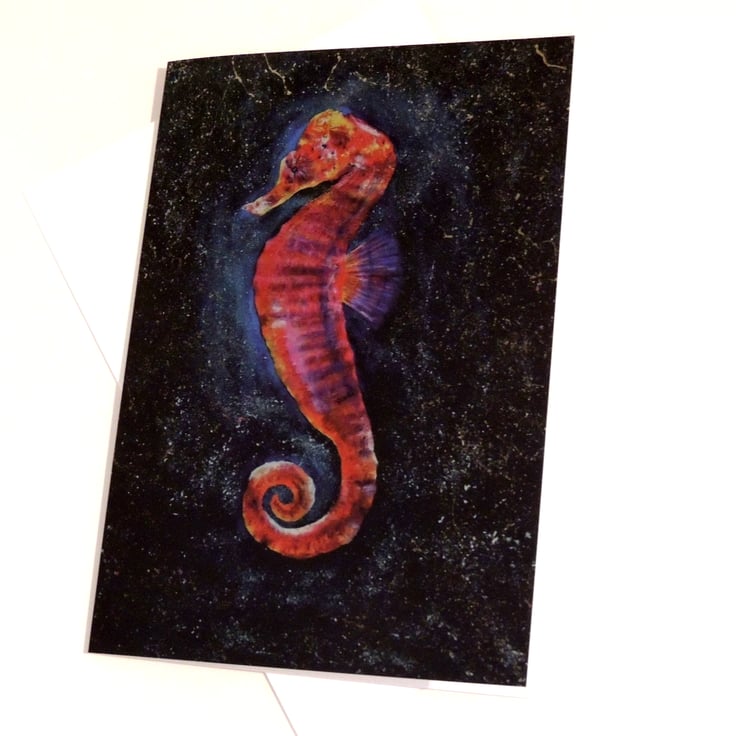 Five rectangle A6 fine art greeting cards produced from an image taken from my own original oil painting of a Seahorse in a fantasy deep-sea setting