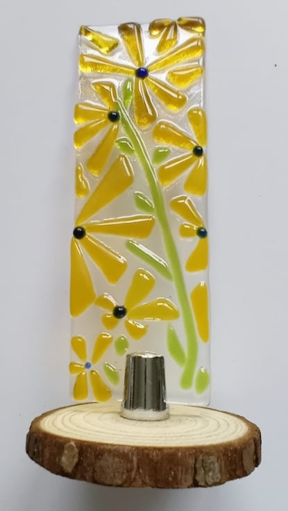 Glass panel measures approx 14.5 x 5cm and is mounted a round wooden disc.