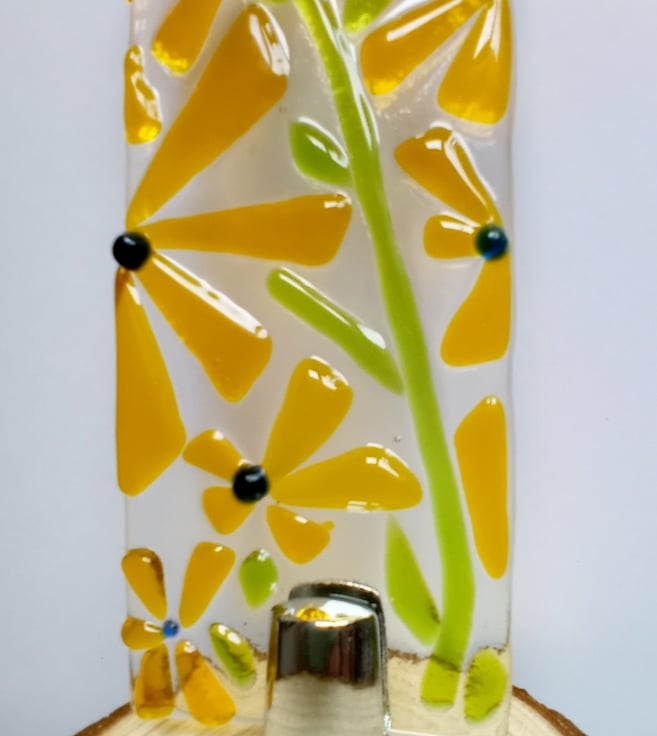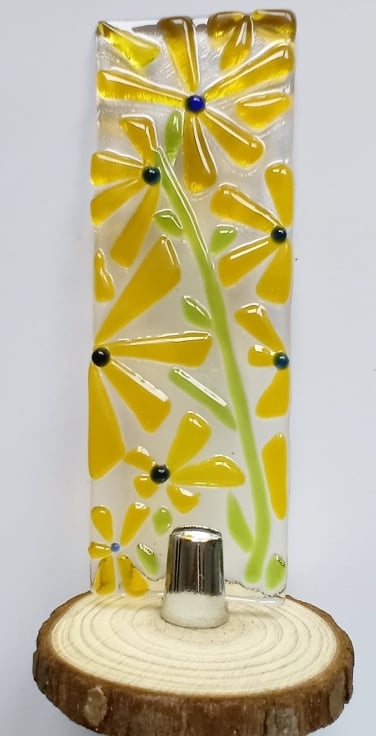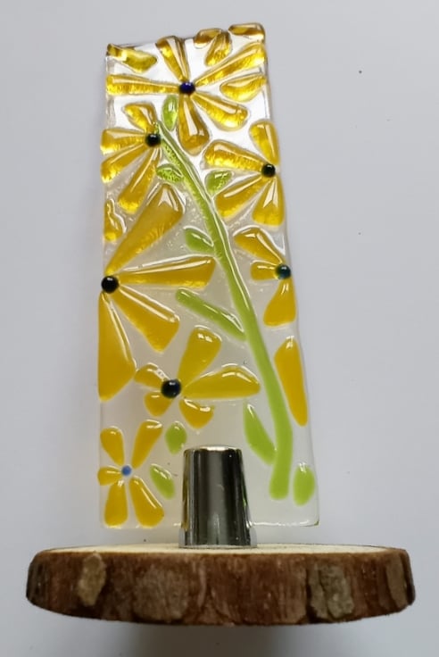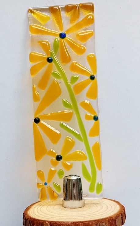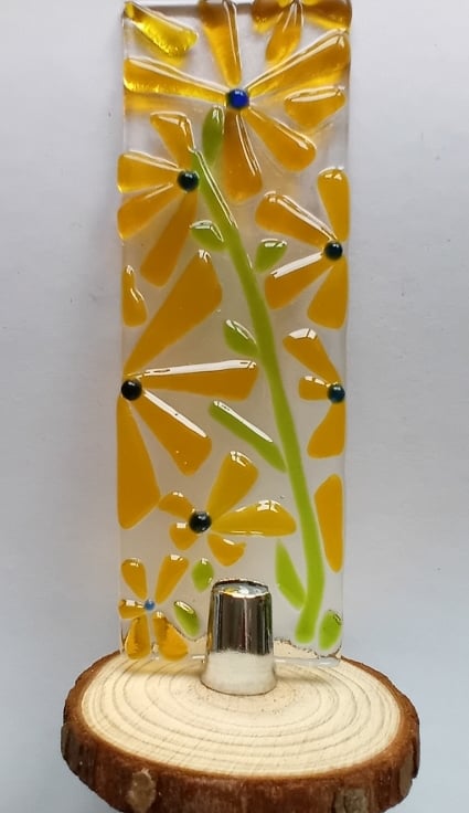 Glass panel measures approx 14.5 x 5cm and is mounted a round wooden disc.
