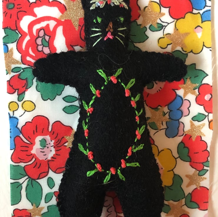 I do not use kits – every’ make’ I create, begins as a picture inside my head and I make up the design of the colours and embroidery as I go along. As such, every make is totally unique and I can guarantee that no one else will have one the same.