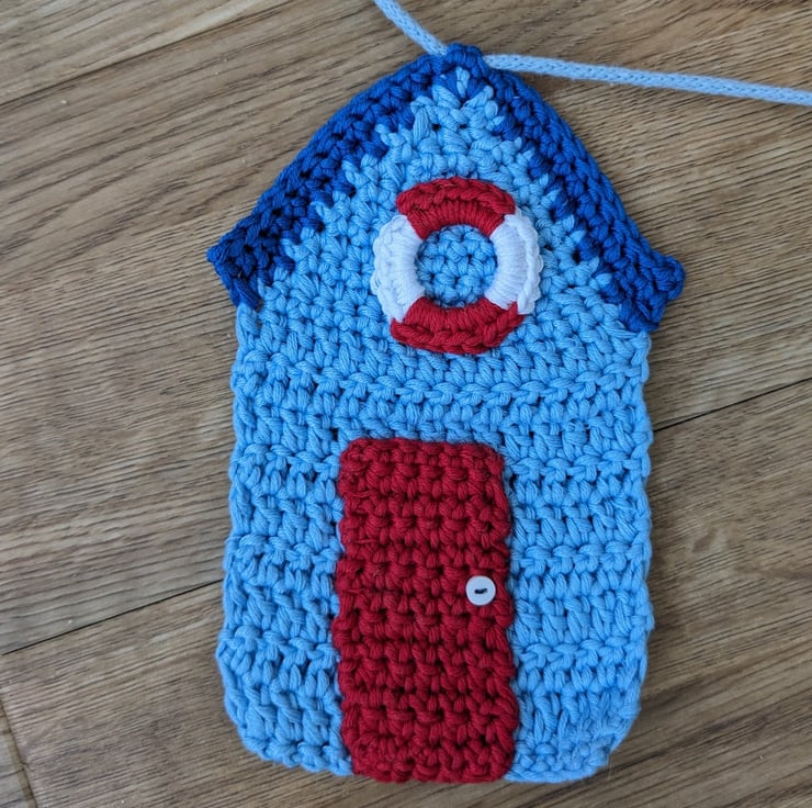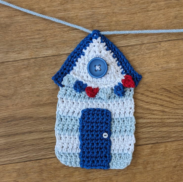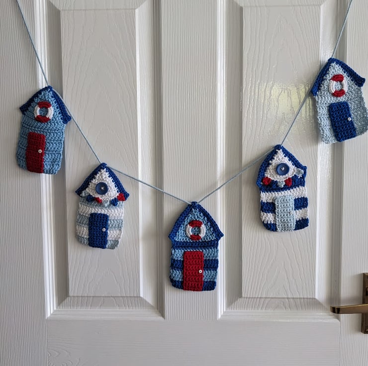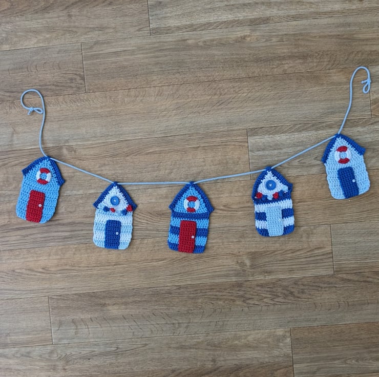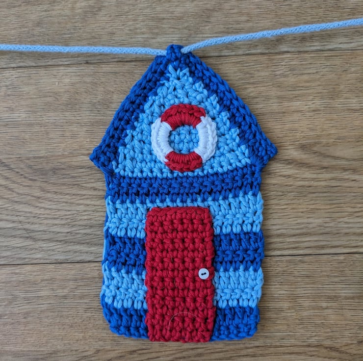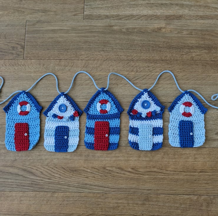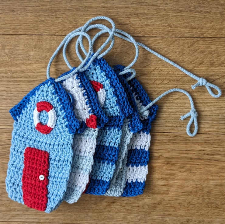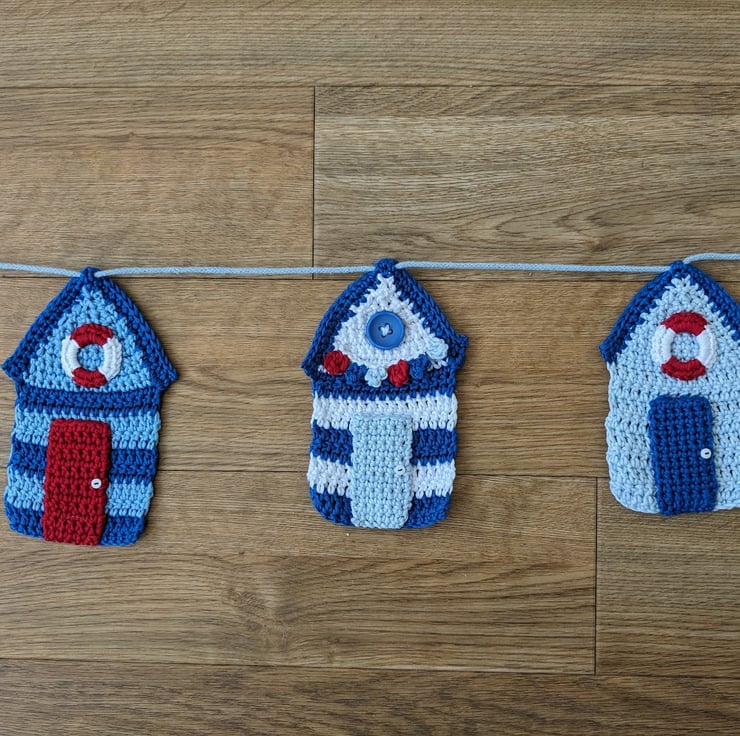 A set of 5 pretty beach huts, crocheted from cotton in shades of red, white and blue. The beach huts are threaded onto a 115cm length of pale blue braided cord which includes hanging loops at each end. The huts can be moved along the cord to be displayed as you wish but they will not slide out of place. The beach huts are all different, but of similar design, each measuring approx. 9cm across and 14 cm tall. Special details include a tiny white plastic button sewn onto each door, three huts display a crocheted red and white lifebelt above their doors, and two of the beach huts even have their own colourful bunting strung across their fronts. This beach hut bunting would make a lovely feature in any seaside themed room, in a child's bedroom, or in a real beach hut if you're lucky enough to have one! Price includes 2nd class postage and packing.