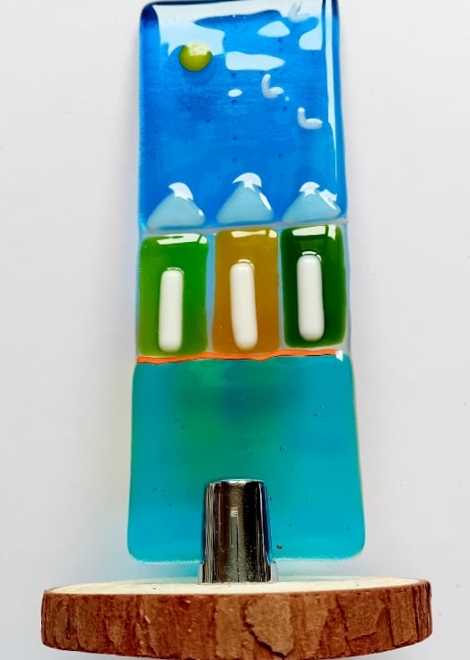 Glass panel measures approx 14cm x 5cm and is mounted a round wooden disc.