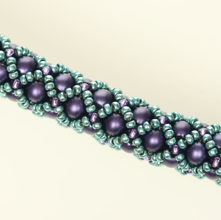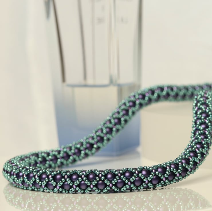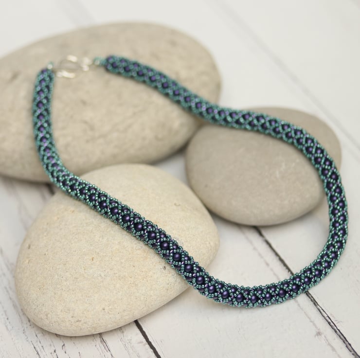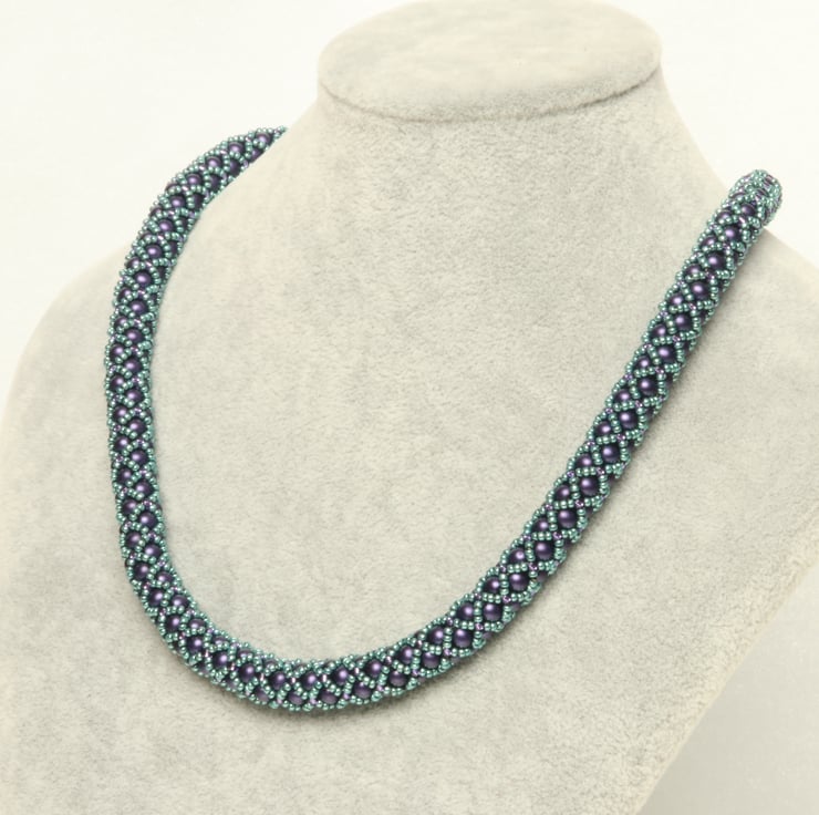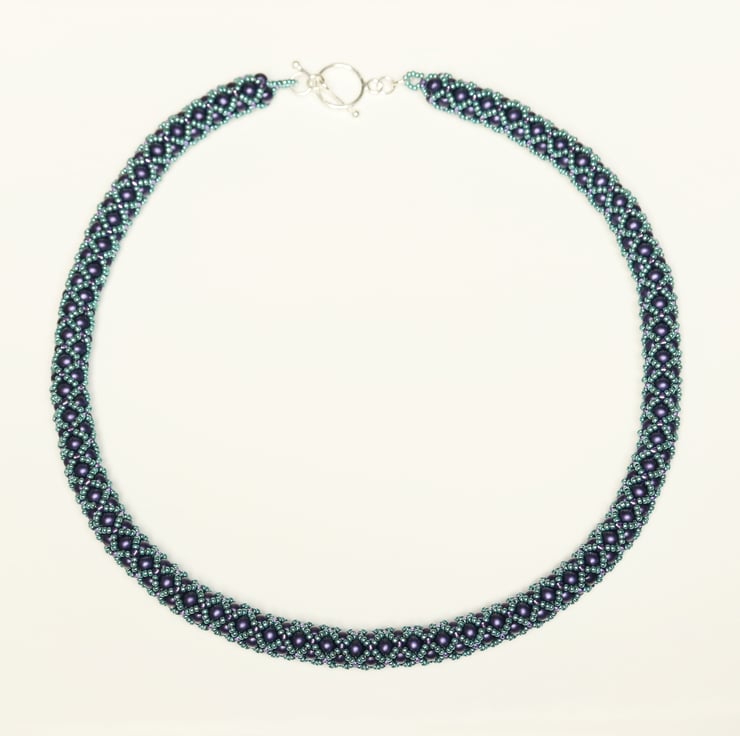 The netted design is a fairly classic beadweaving design. The beads are actually stitched into place inside their 'net'. This makes a substantial but delicate looking necklace with medium flexibility and drape.