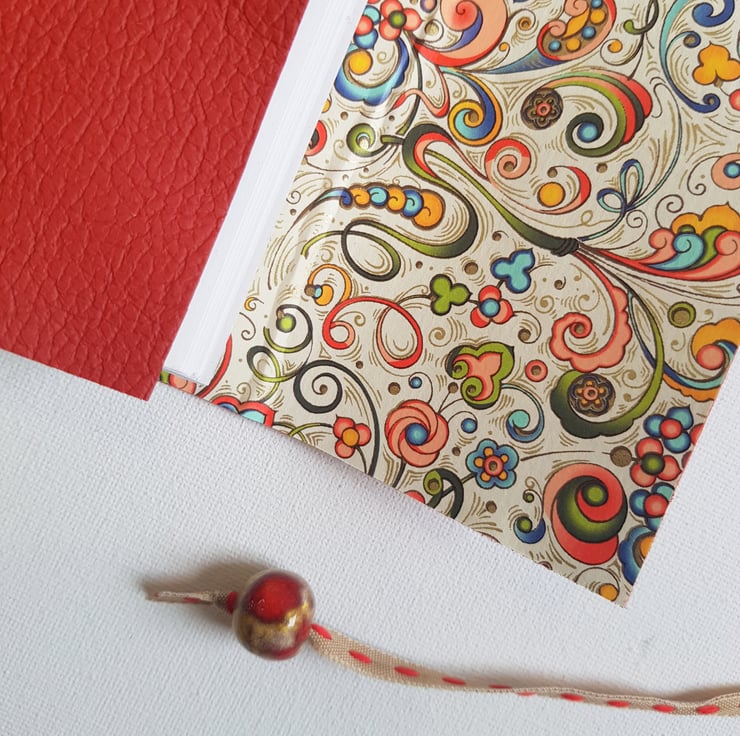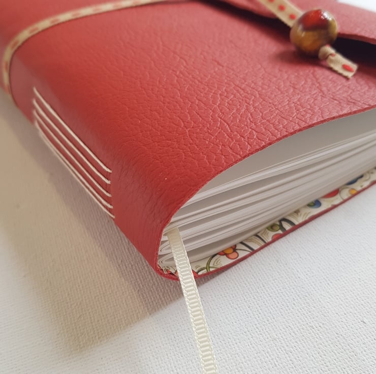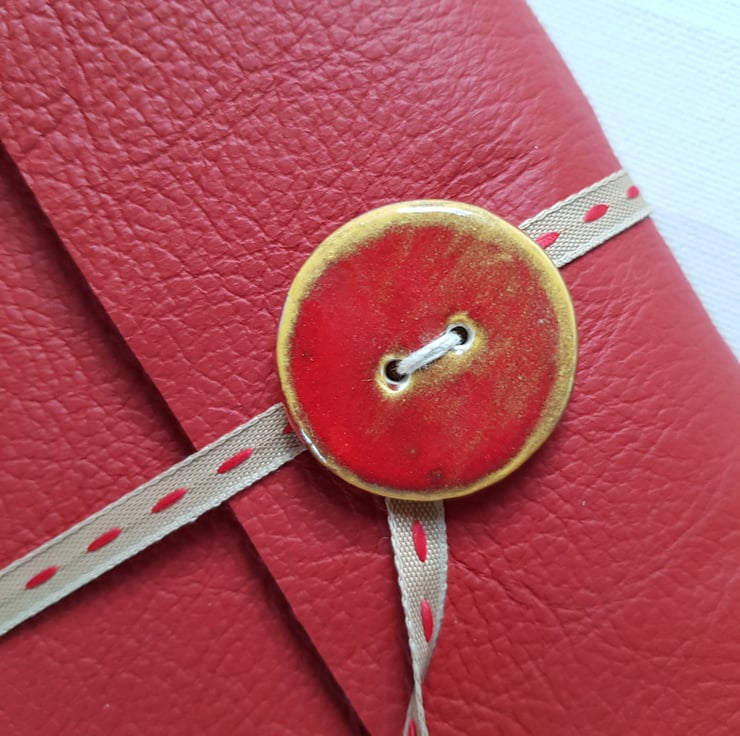 Beautiful Red Leather Journal Hand Bound with a beautiful Art Nouveau style paper lining the covers. The Journal is closed with a Hand Made Red Ceramic Button and a stitched ribbon wrapped around (ribbon design may change due to availability) . Perfect for Journaling, bujo, Sketch Book, Wedding Journal or Art Journal.
