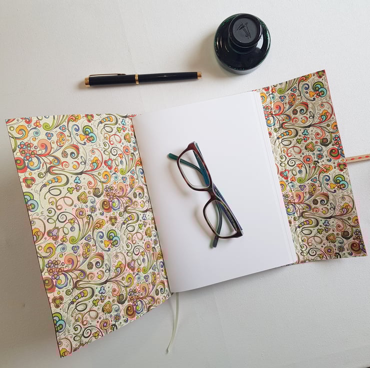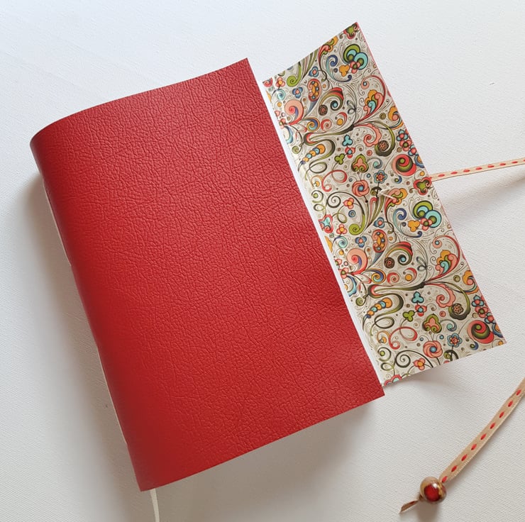 The Journal lies completely flat when in use and has a handy Ribbon Page Marker. All my Journals are Refillable, a kit is available in my shop.