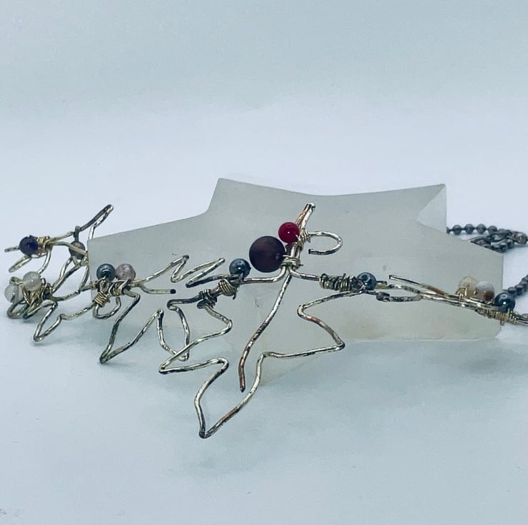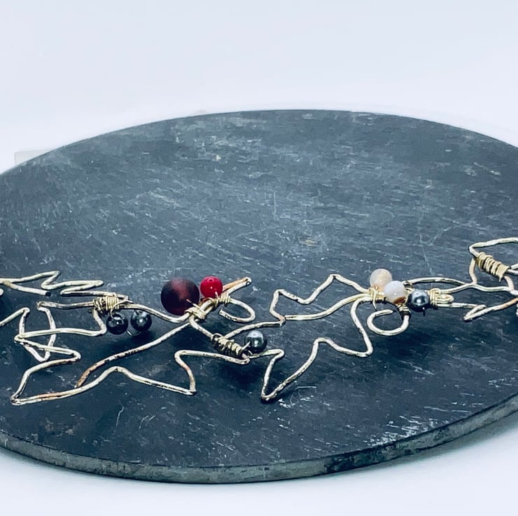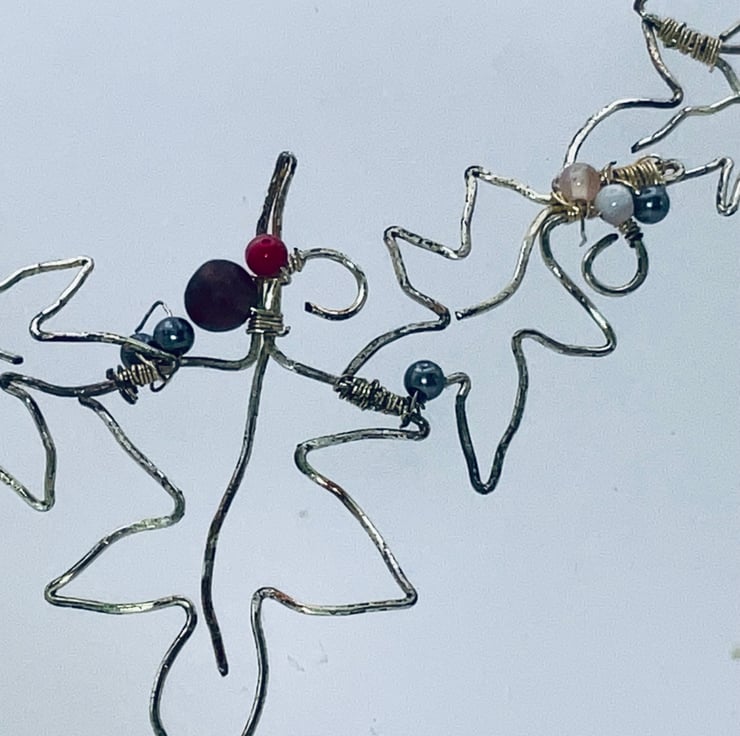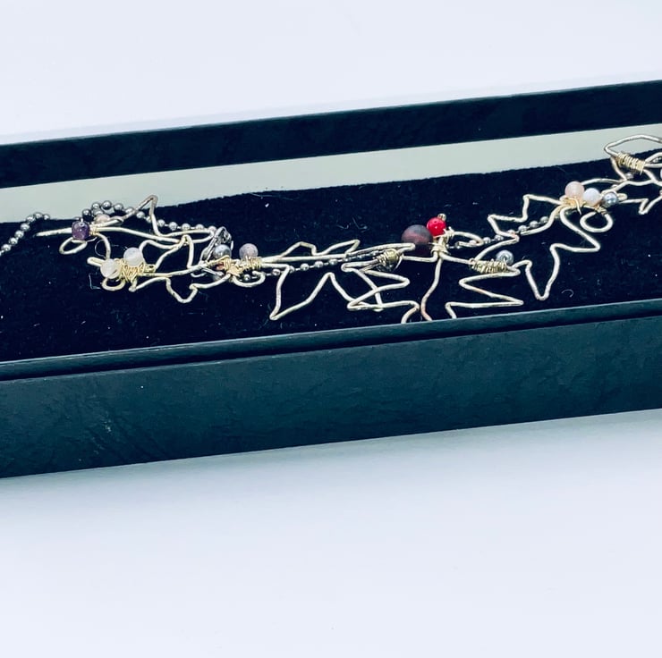Outlined sycamore leaves in graduating sizes, with the largest of the five in the centre is a necklace of sheer delight! The leaves are also embellished with a variety of agate beads. This is a bib necklace, which describes where the necklace sits. It is held on a silver bobble chain making a necklace equivalent of a 600 mm necklace. The length may be adjusted to whatever length you desire. This is purely a design of my very own, which makes it a very special one indeed. It will make a rather dressy gift for almost anyone. Probably to be worn at an evening event. It can embellish any garnet of any colour,. This versatility makes it the perfect gift for a lady who enjoys the unusual!