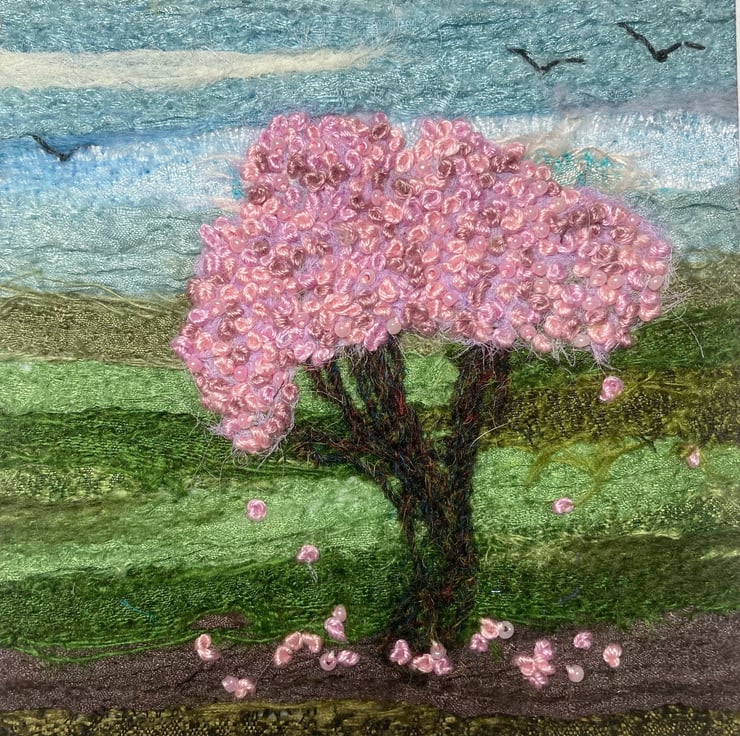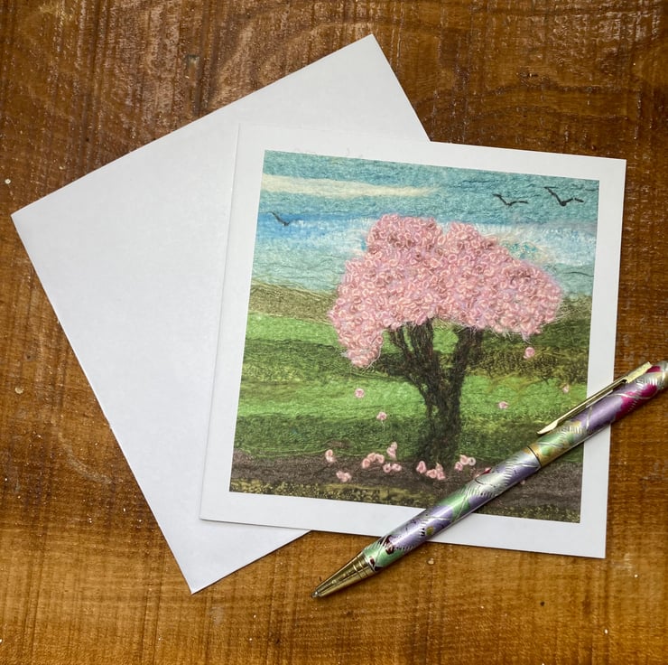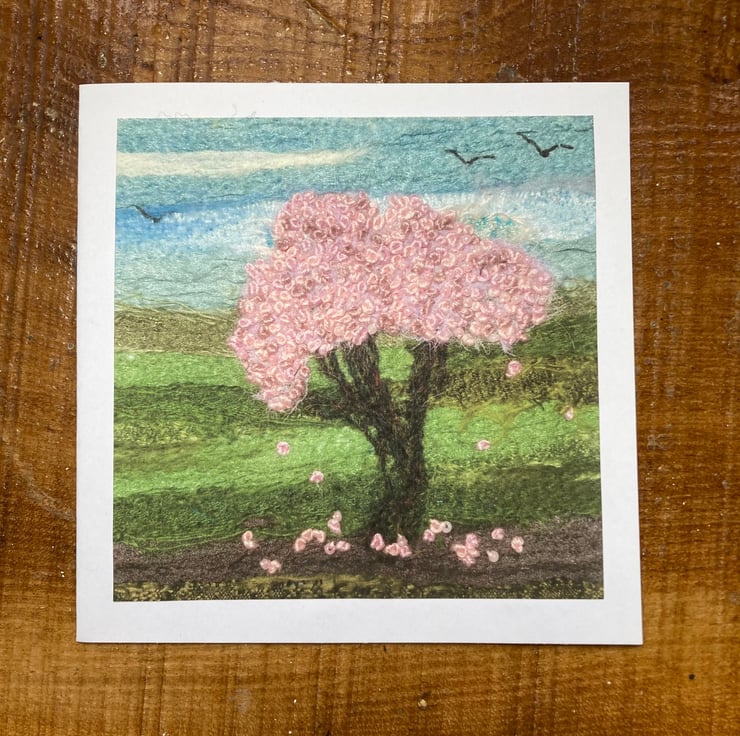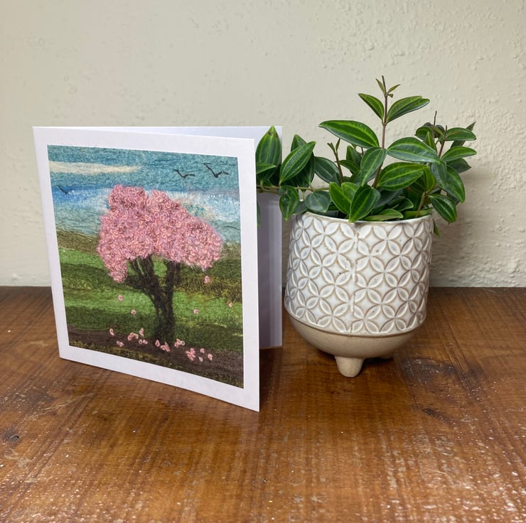 This card is of a pretty pink blossom tree in springtime. This greetings card has been made using a print of some original textile artwork. The original artwork consists of needle felted silk fabric and wool fibres and also included embroidery and beadwork. The print has been mounted on a white card measuring 5"x5". It has been left blank for your own message and comes with a white envelope.