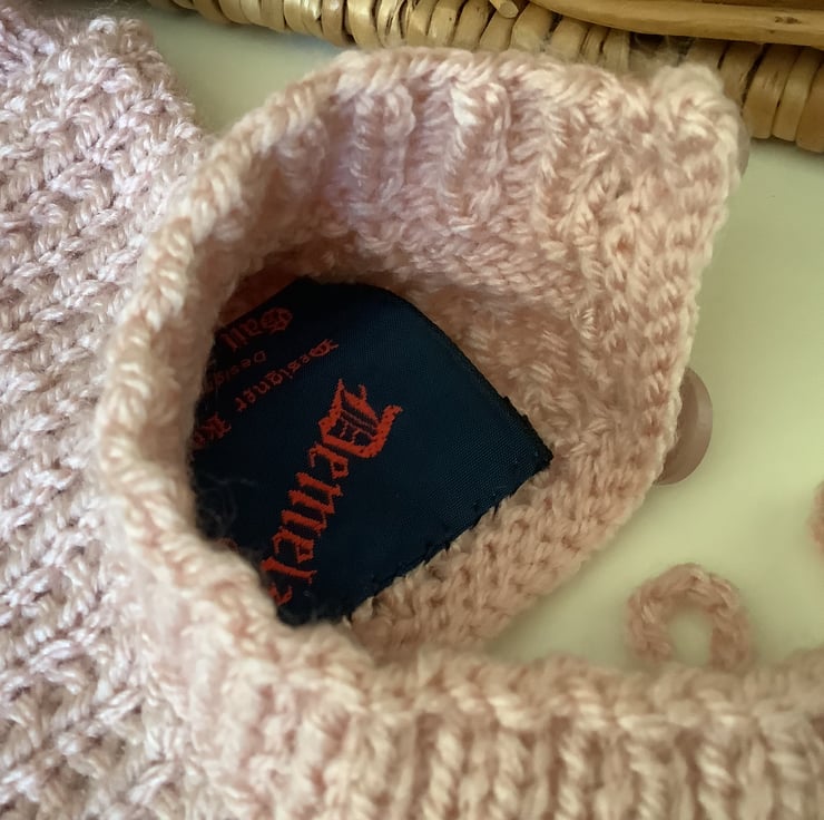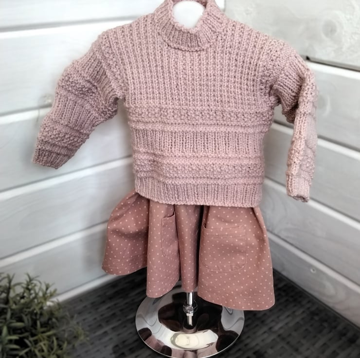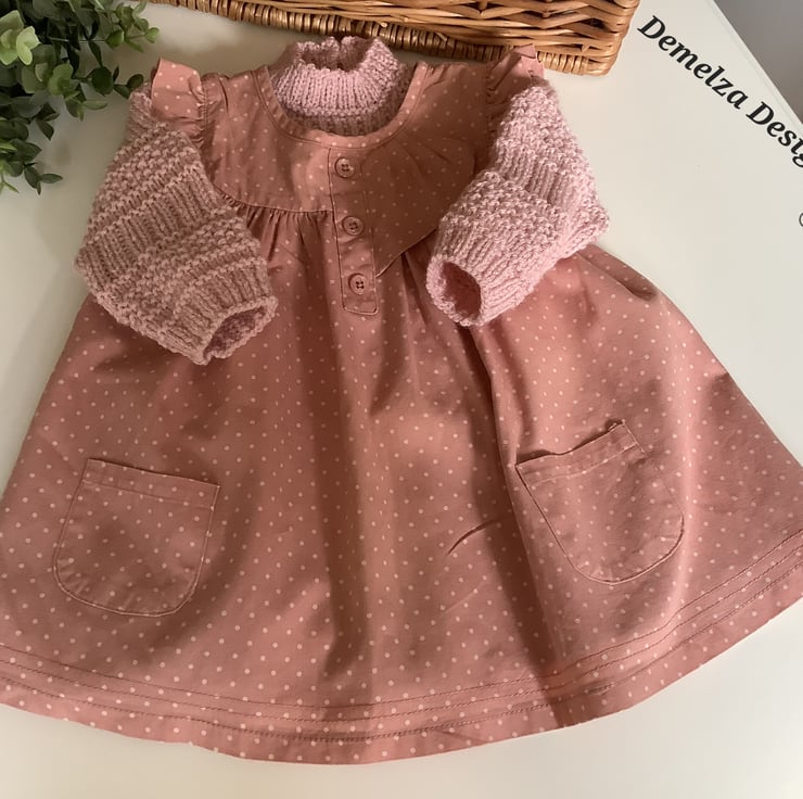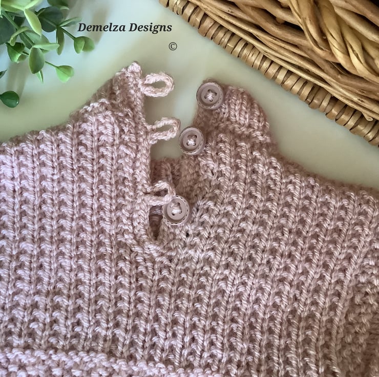 A practical cosy warm baby girl's jumper lovingly designed and hand crafted using quality branded machine washable acrylic yarn. The back has three genuine darker salon pink wooden buttons with loops for ease doing up. On the back side opening the branded Demelza Designs garment label has been attached with the care instructions woven within it for lasting reference. The garment will sldo have the Demelza Designs luxurious garment swing tag attached prior to dispatch for a professional touch if gifting.