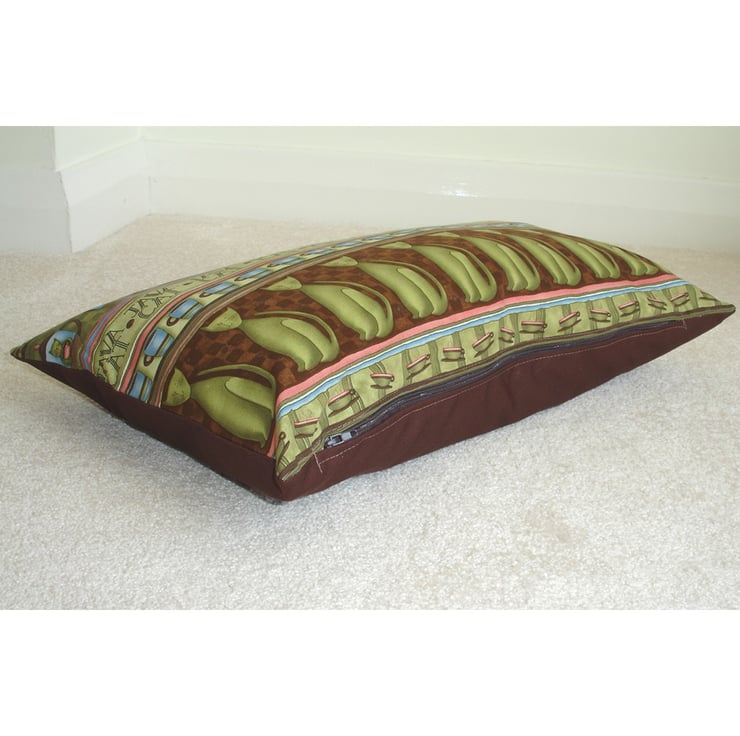 The back of the cushion cover is in a plain co-ordinating brown cotton fabric with a zip at the base for easy insertion and removal of the cushion pad.