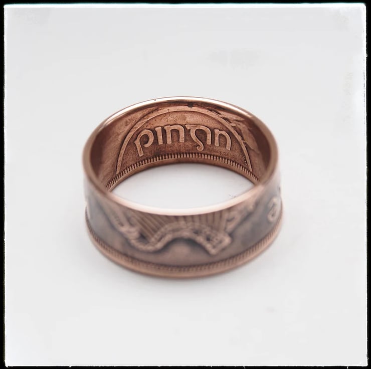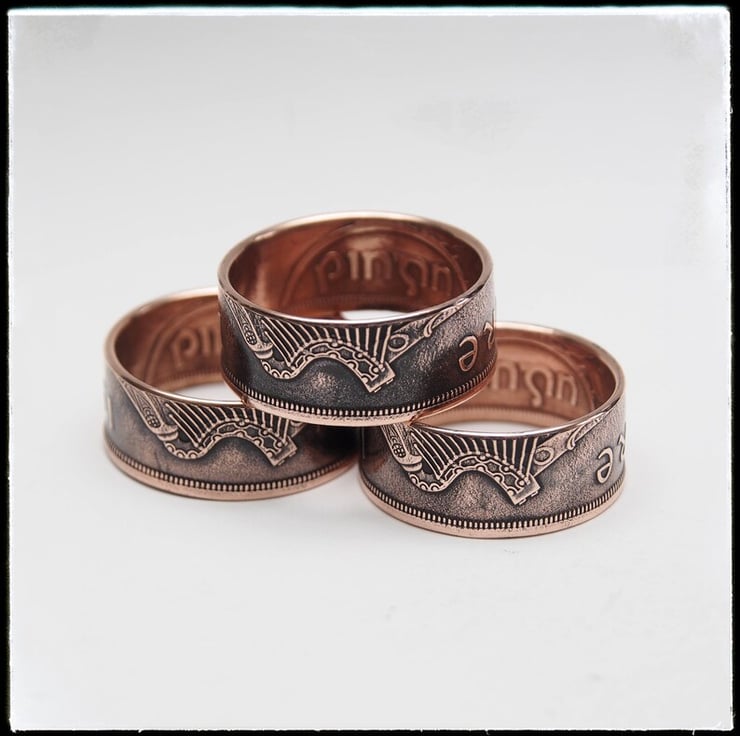 Here we have a stunning 1968 Irish “lucky penny” coin ring in a variety of sizes. These have been made using 1968 Irish pennies, the last year minted before decimalisation in 1971, an interesting part in Irish history. The details on this have been beautifully preserved during the reforging process. The intricate design has been highlighted using a chemically applied patina which will eventually wear leaving a more natural look, or you could just hit it with the brasso and make it like new.