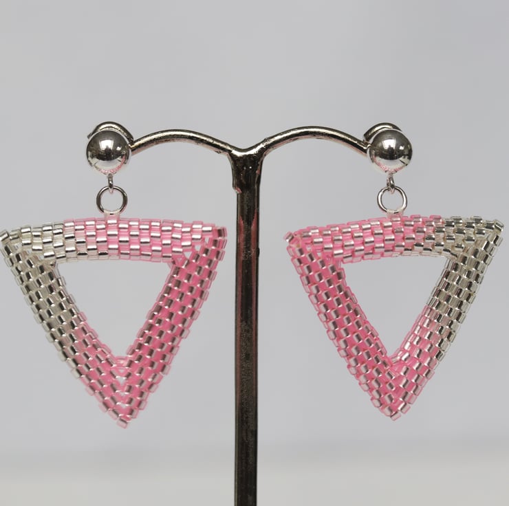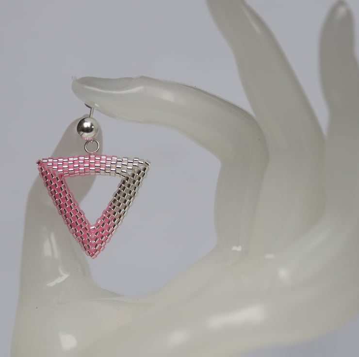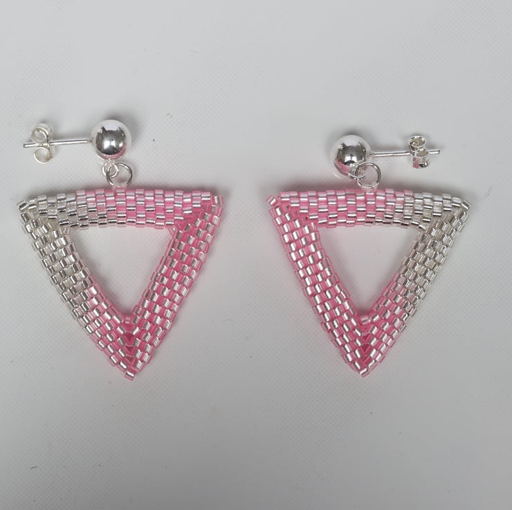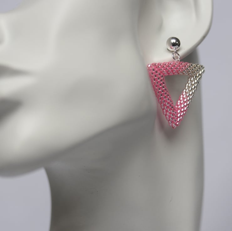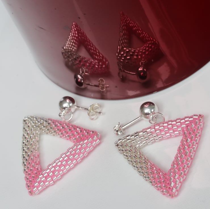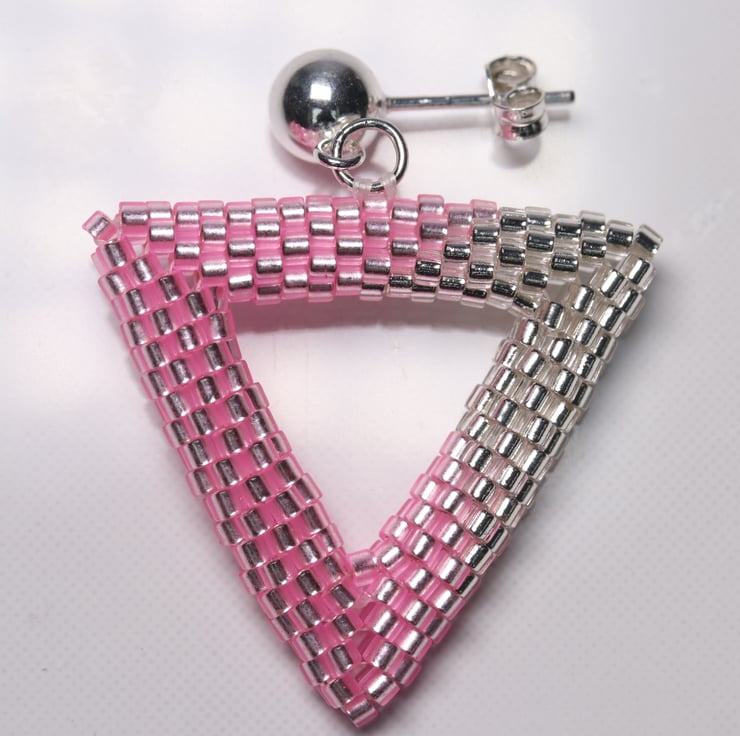 To make these earrings I have used size 11 silver-lined Miyuki Delica beads in crystal and in pink. They are made by a process called beadweaving, by which the beads are sewn together by strong Fireline beading thread (not unlike fishing line).