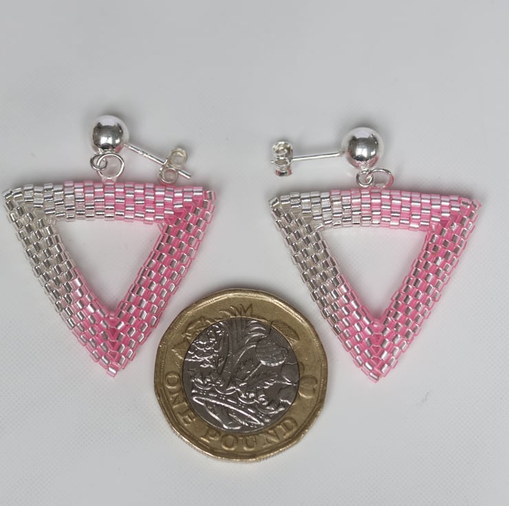 Each side of the triangle is 2.9 cms (1.1 ins) long. They are very light in weight – weighing around 2gms each. Please see the photograph of the earrings with a £1 coin for size comparison.