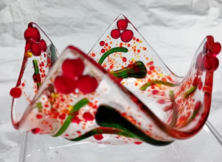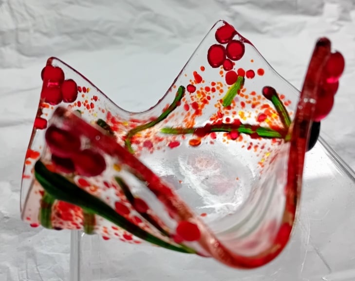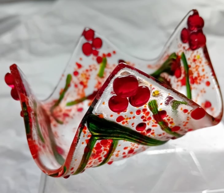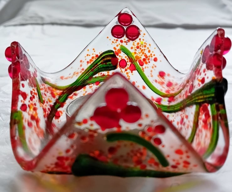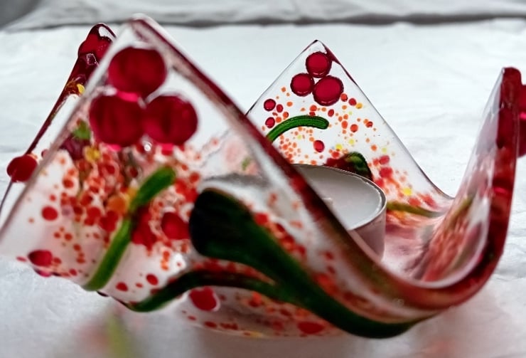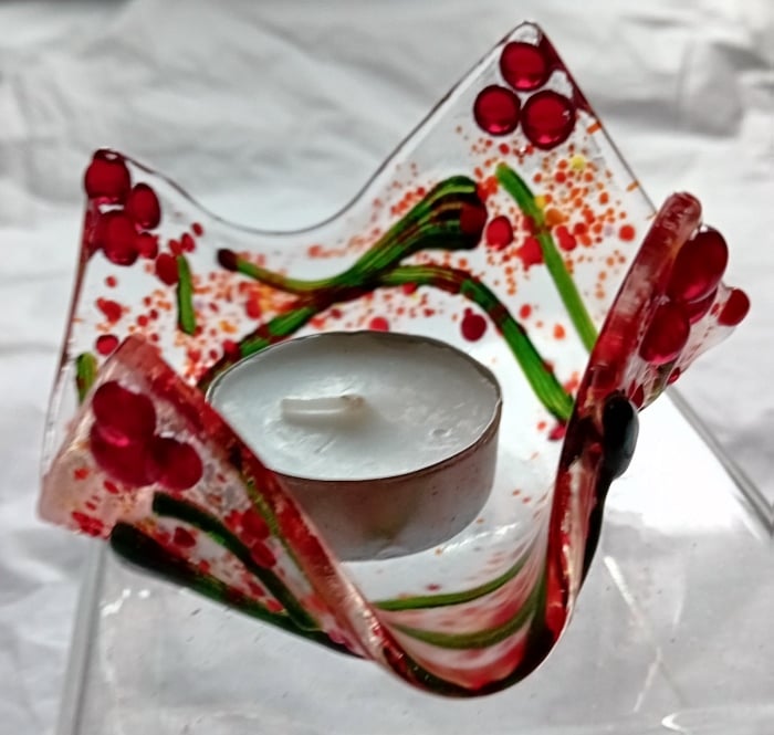 Hand crafted Fused glass candle/tea-light holder decorated with small red blobs - perfect for adding a pop of colour to your festive table