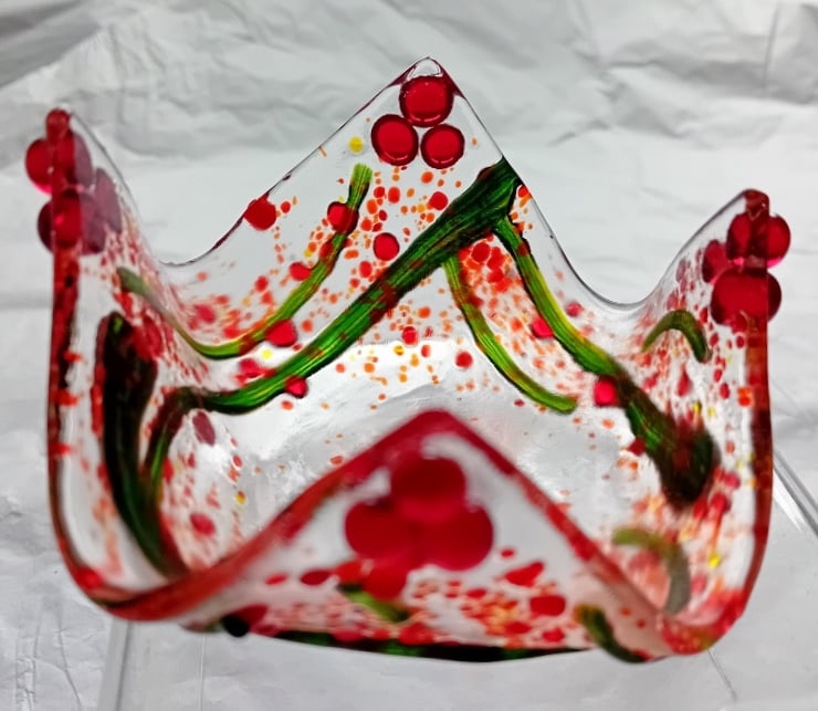 Hand crafted Fused glass candle/tea-light holder decorated with small red blobs - perfect for adding a pop of colour to your festive table