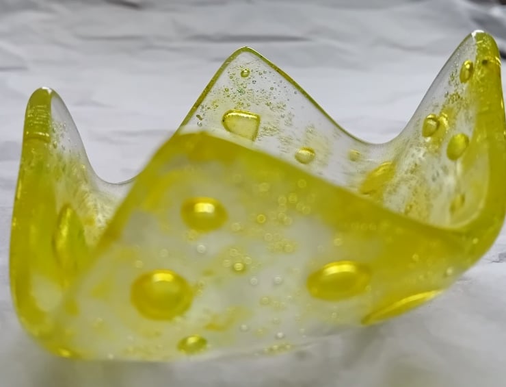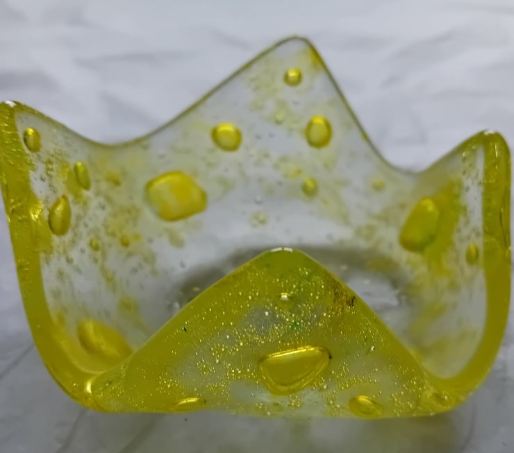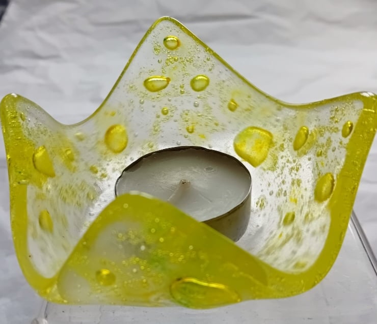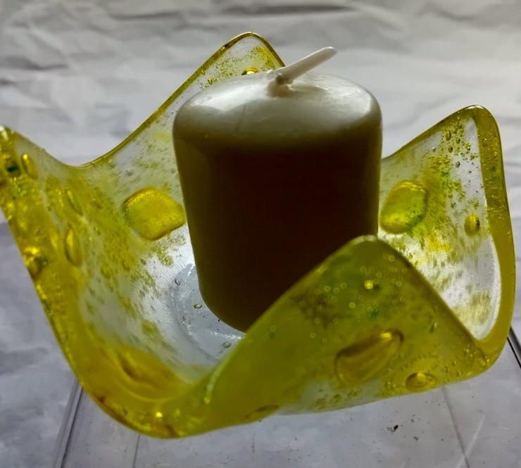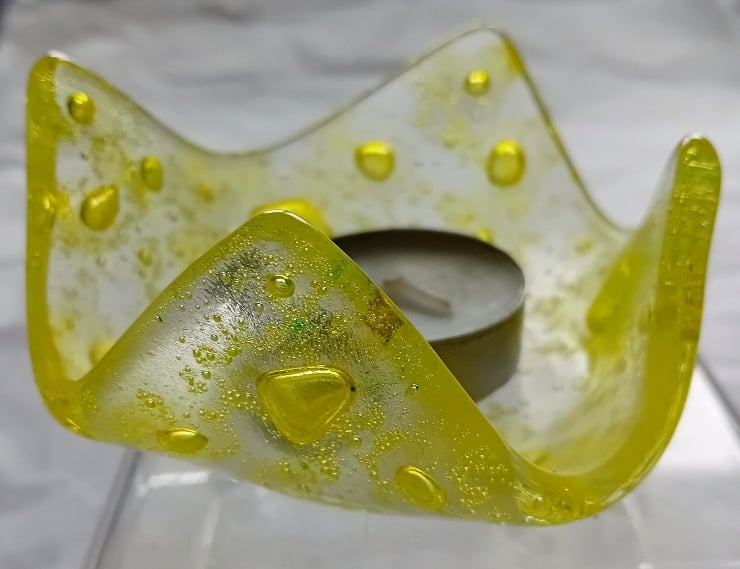 Fused glass candle/tea-light holder with lemon yelllow bubbles in the glass