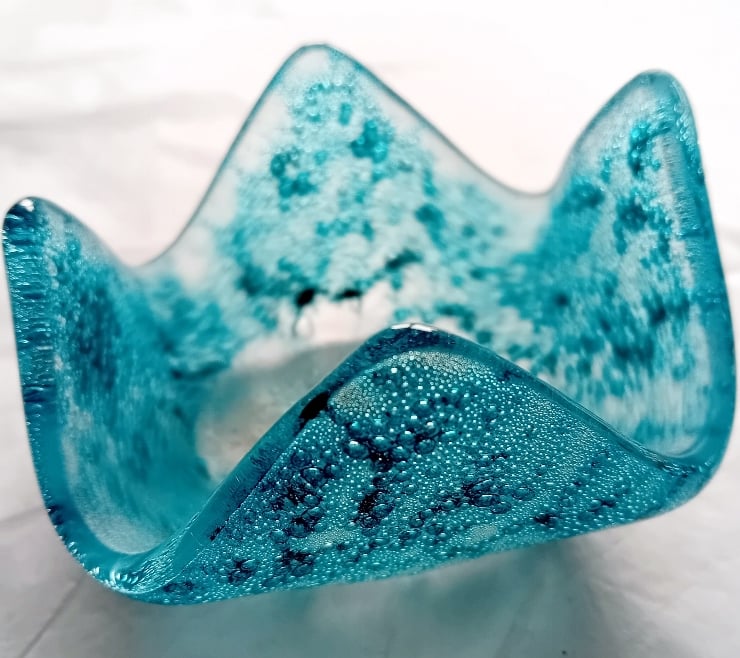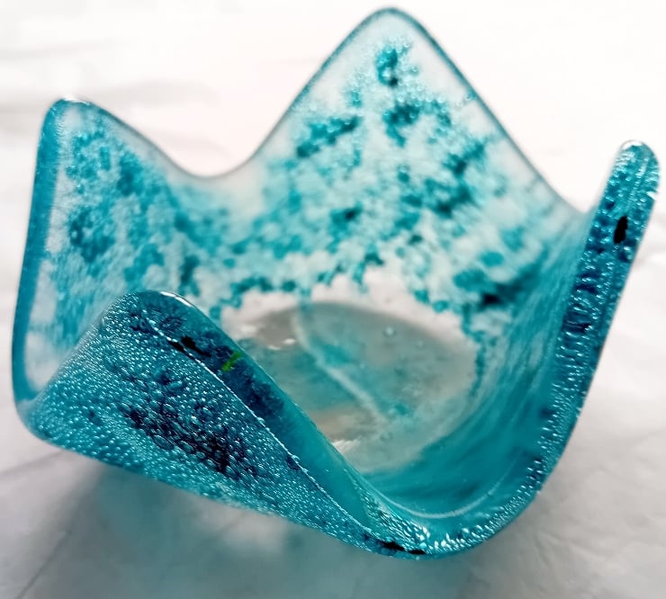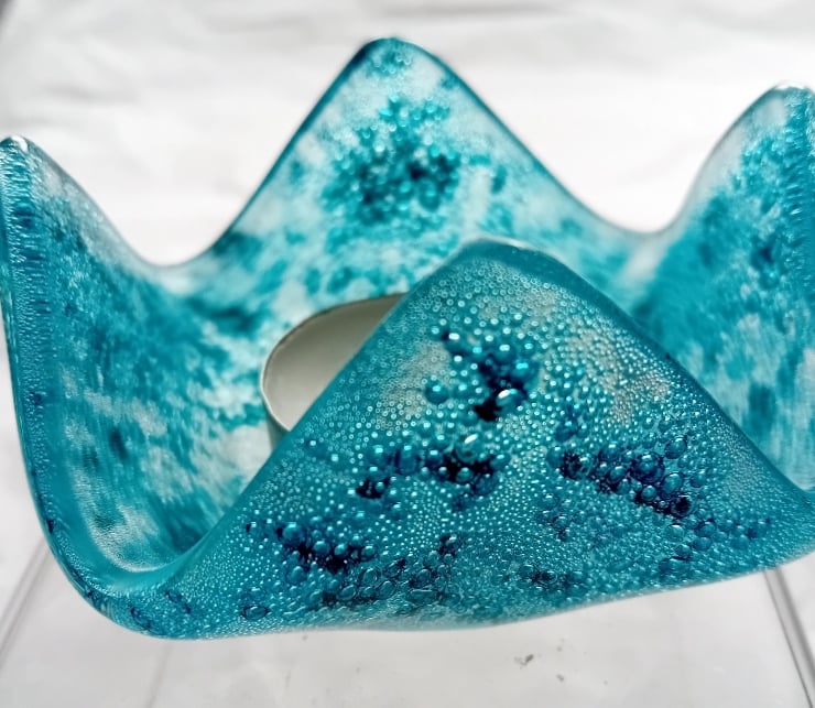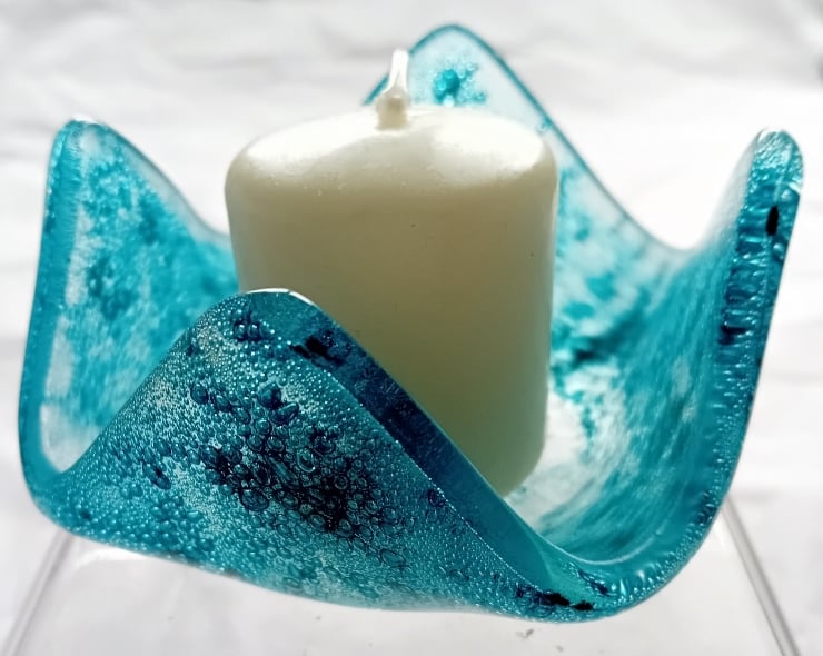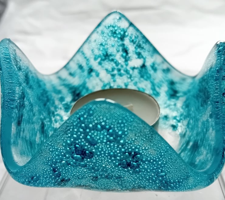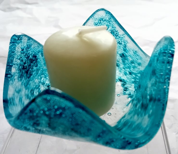 Fused glass candle/tea-light holder with turquoise bubbles in the glass