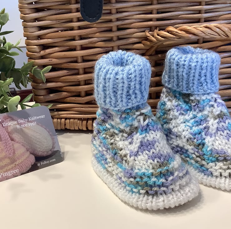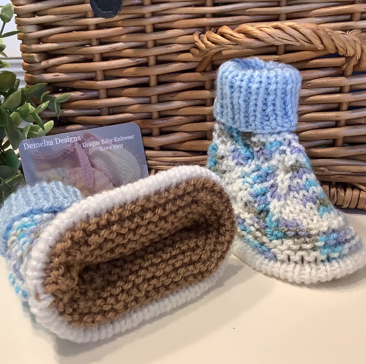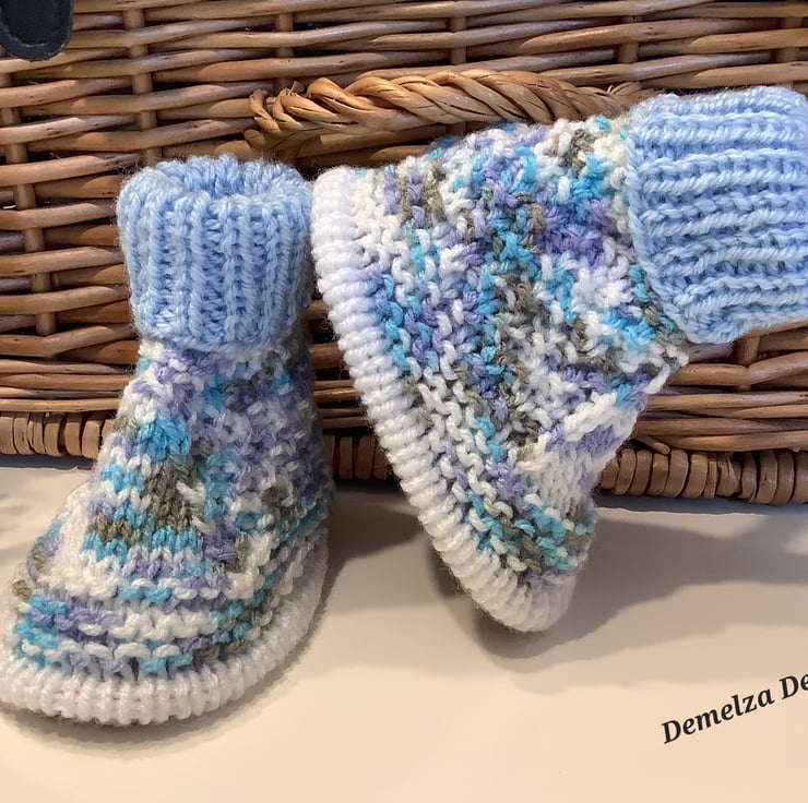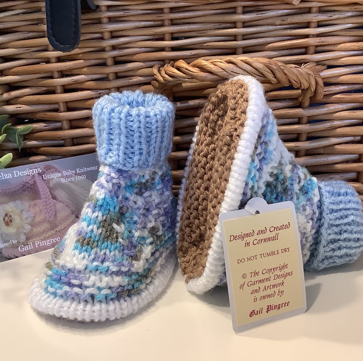 A fabulous funky pair of baby boy's booties lovingly designed and totally hand crafted using quality branded machine washable acrylic yarns.