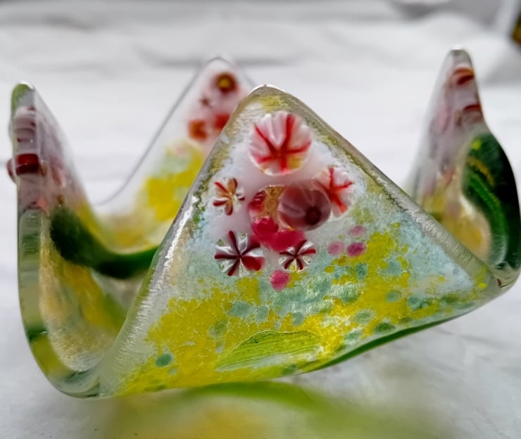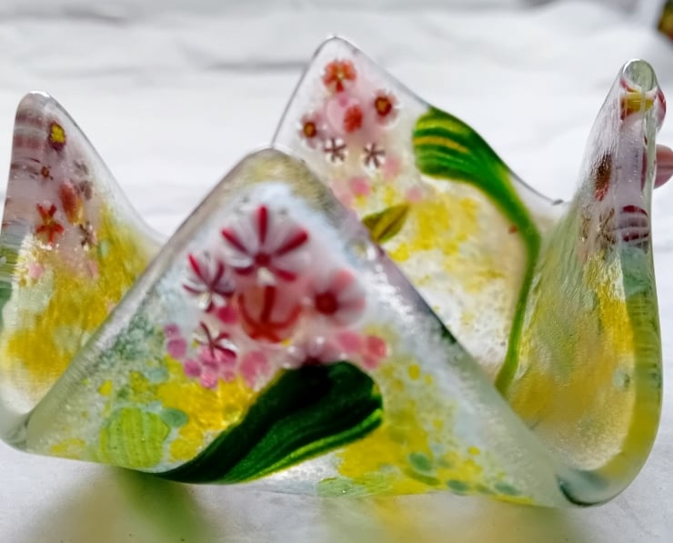 Hand crafted fused glass candle/tea-light holder decorated with pretty pink flowers. This beautiful piece is perfect for adding a touch of warmth and elegance to any room.