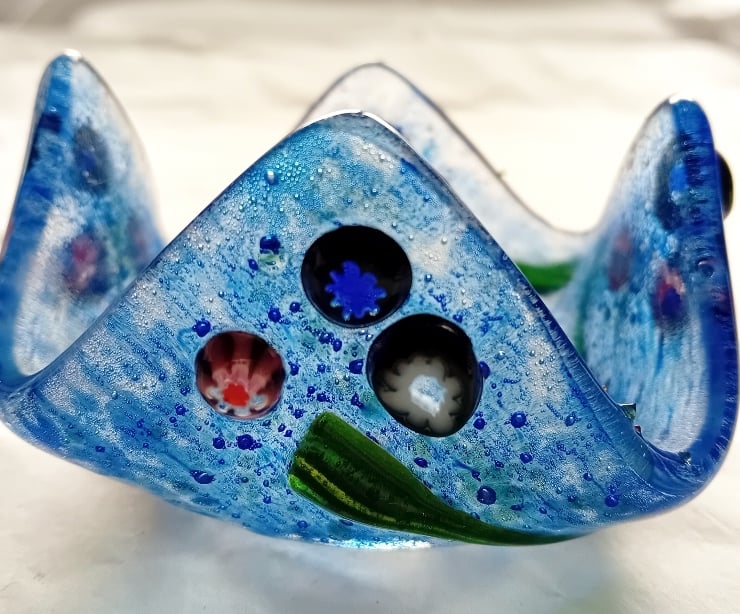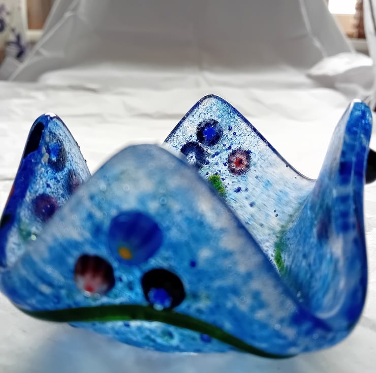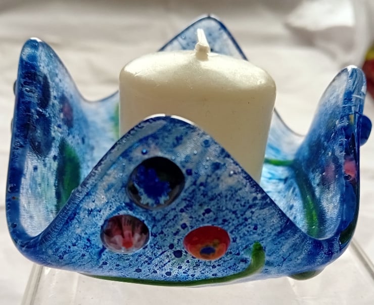 Fused glass candle/tea-light holder with tiny blue bubbles in the glass and decorated with coloured 'flowers'