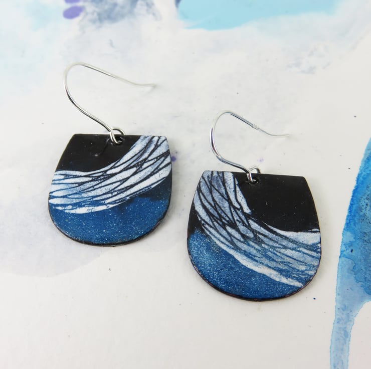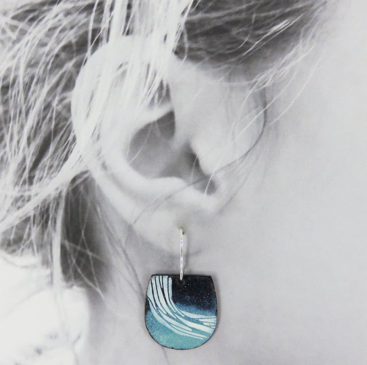 Copper semi ovals have been cut from copper. Layers of black and turquoise enamel have been applied. A flash of white has been hand painted on and lines drawn through by hand. The backs are shiny black enamel. They hang on silver plated wires.