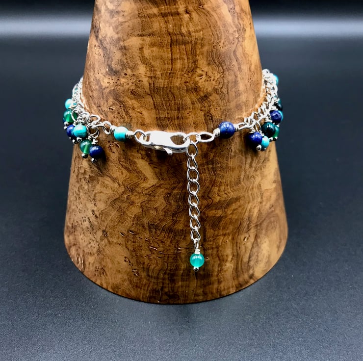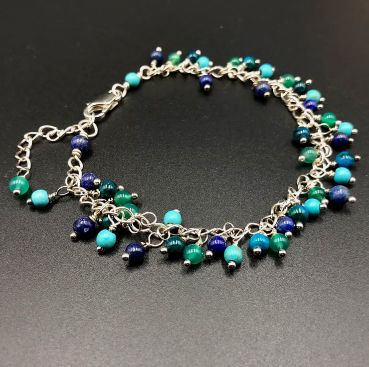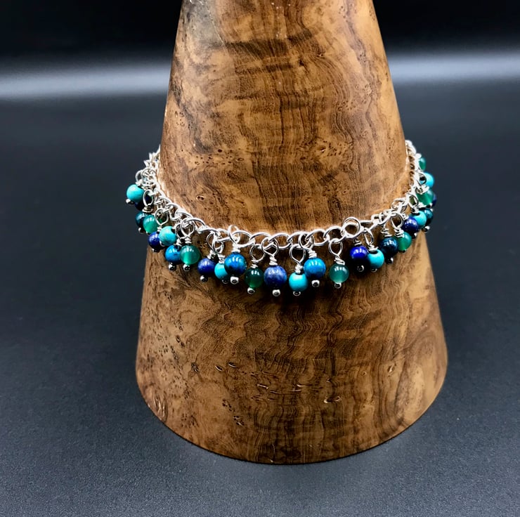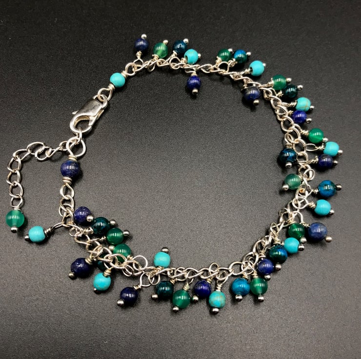 A mixture of 4 mm rounds of sodalite, green onyx, chrysocolla and turquoise beads are individually attached to a silver plated bracelet to give a lovely mix of sea blues and greens.