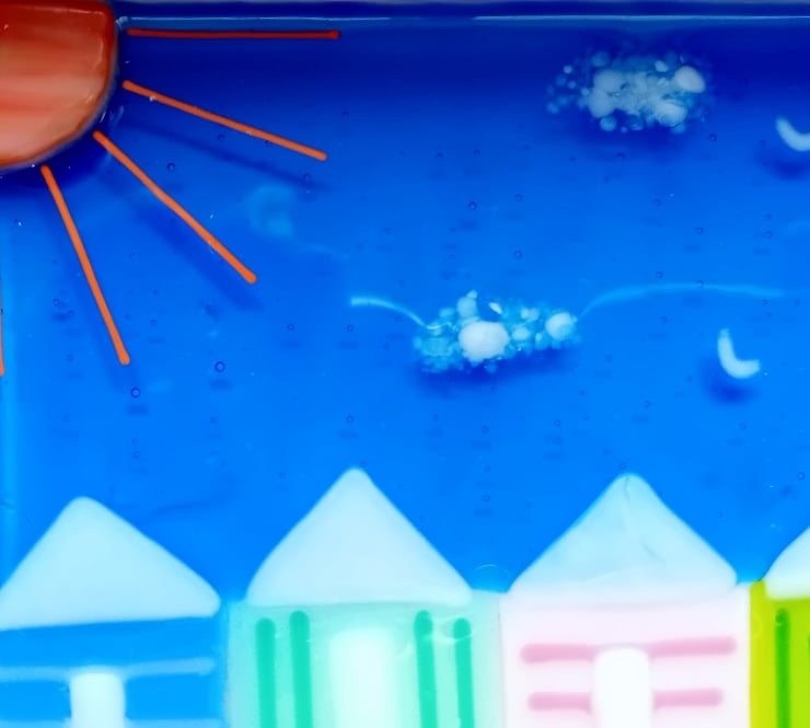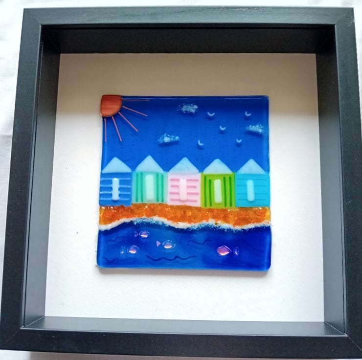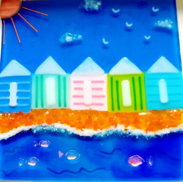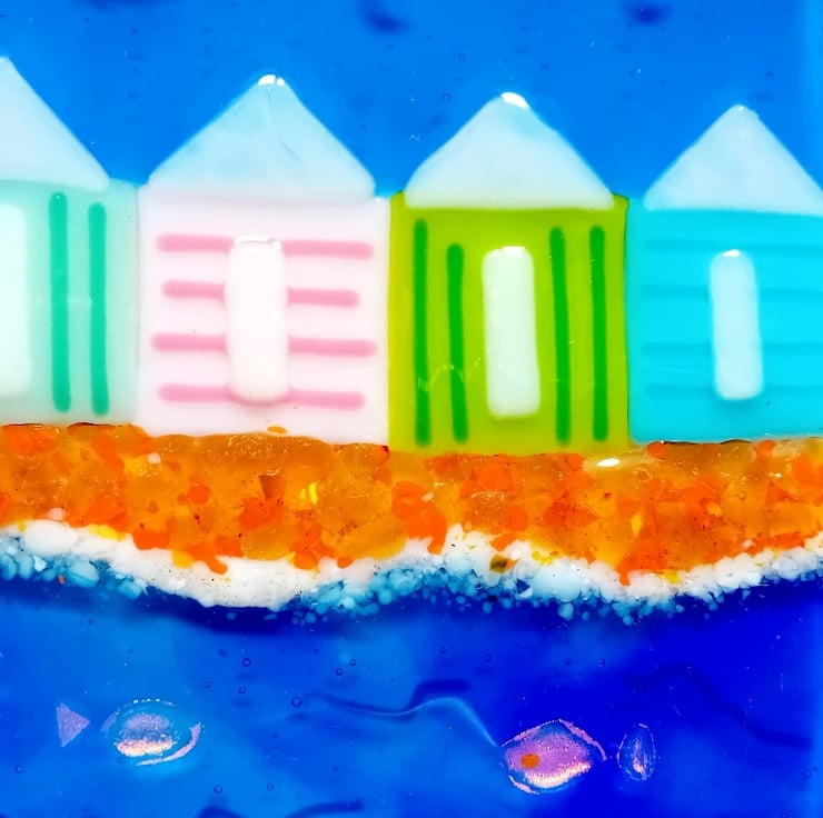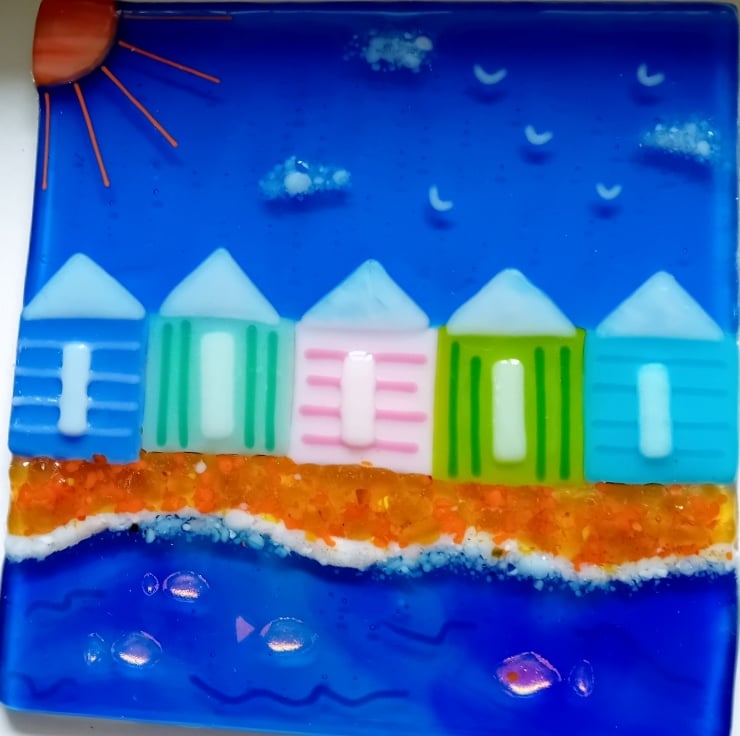 This beautiful piece of fused glass art features 5 beach huts in soft, pastel shades of blue, green, and pink, with fishes swimming in the sea. The scene is carefully crafted to evoke a sense of coastal charm and serenity.