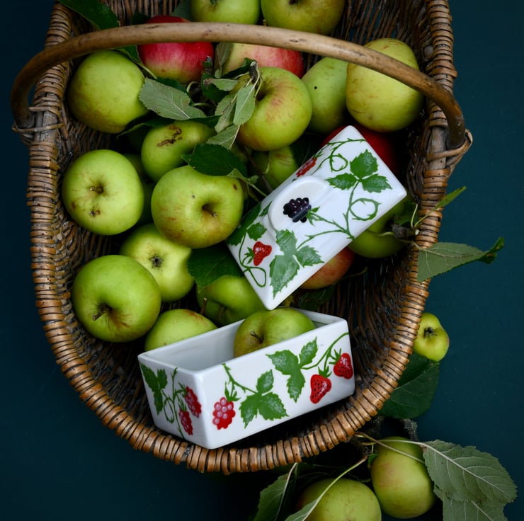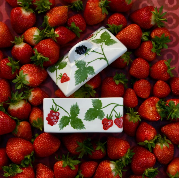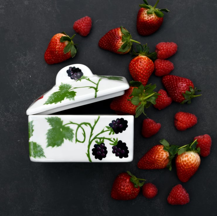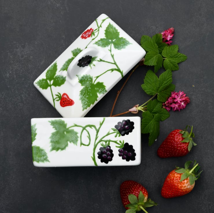 This Wild about Berries Butter Dish is hand painted by me with strawberries, raspberries and blackberries all over the butterdish.