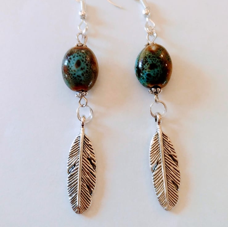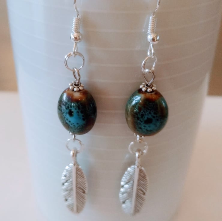 Has a beautiful patina effect design and vintage flair. Featuring a silver metal leaf dangle charm. Silver plated ear wires,