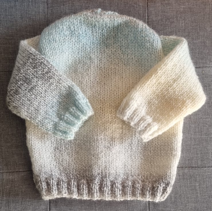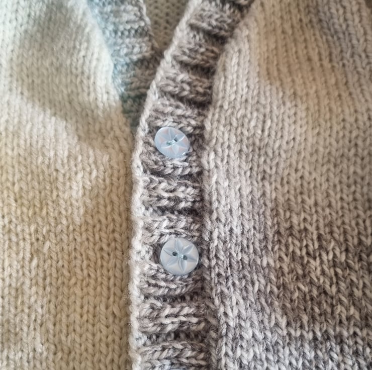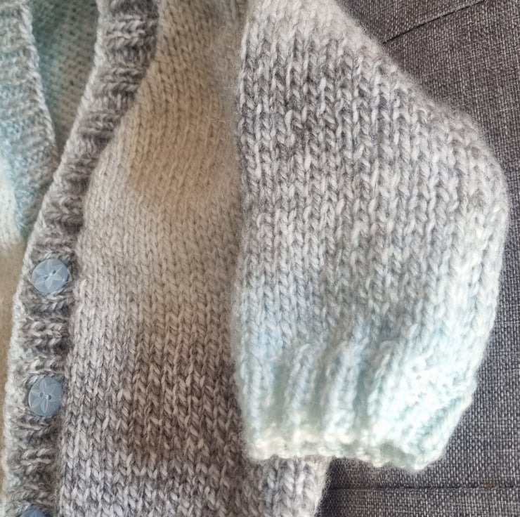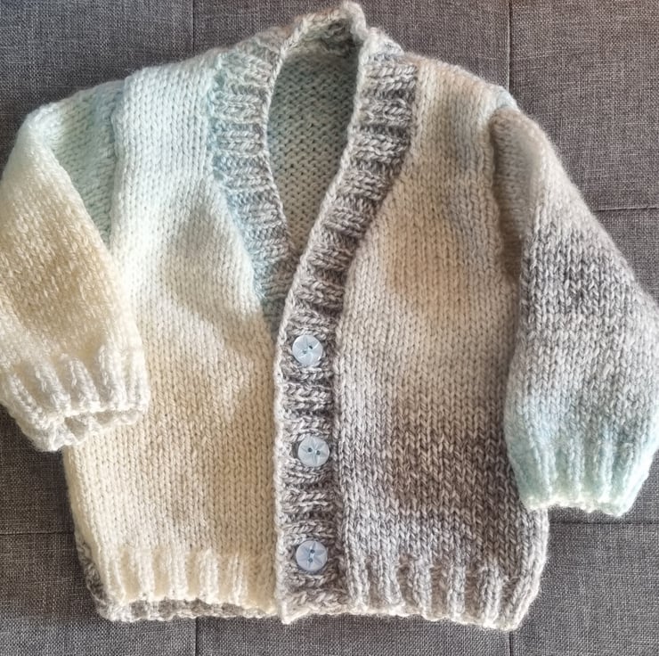 This beautifully hand-knitted baby cardigan is designed to fit newborns up to 6 months. It features long sleeves and a V-neck with button fastenings, crafted from soft wool in lovely shades of pastel blue, grey, and cream.