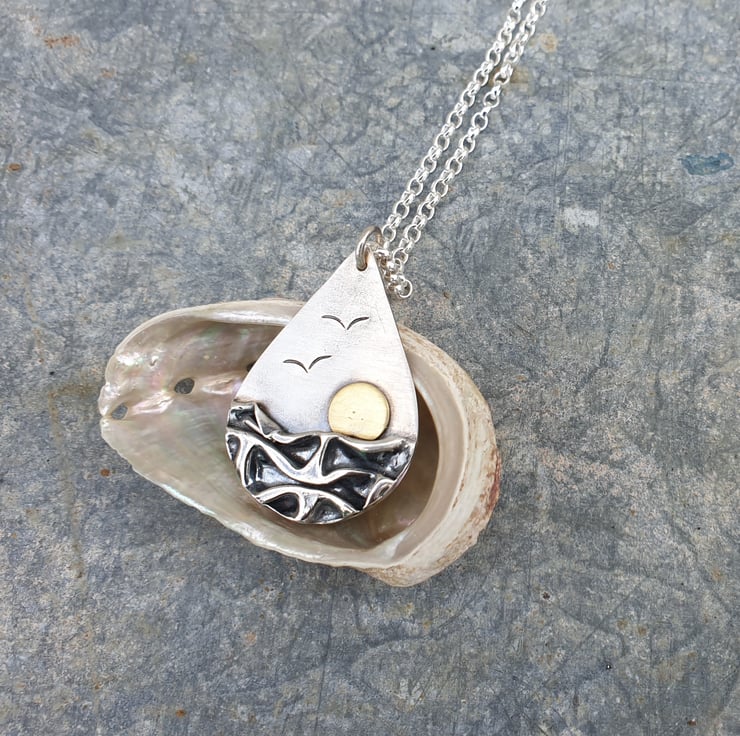 Inspired by my love of the beautiful Norfolk coast. This teardrop shaped pendant is handmade in sterling silver with a layer of folded fine silver to represent the beach or sea. The sun is made from brass and has 2 stamped seagulls flying in the wind. The pendant has been oxidised to give the effect of a hazy sky. It measures approx 35mm top to bottom and 25mm across at it's widest point and comes complete with a sterling silver belcher chain which fastens with a lobster clasp Due to the techniques used in making them, each of these folded silver pendants is unique.