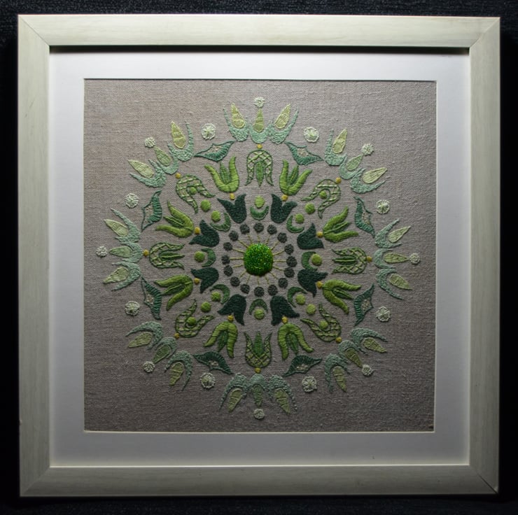 Stylised floral stitch sampler using more than 12 different stitches in shades of green with a beaded centre. The piece is stitched on hessian and framed, external measurements 45cm (18 ins) square. A one off.