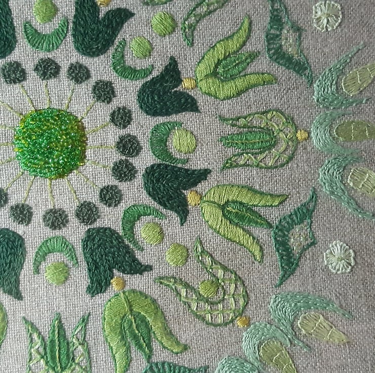 I found a 1970s pattern for a cushion cover in my stash with very simple stitchery. I adapted the pattern and used multiple stitches in shades of green. It is a one off but I would be pleased to make another in a different colourway on commission.