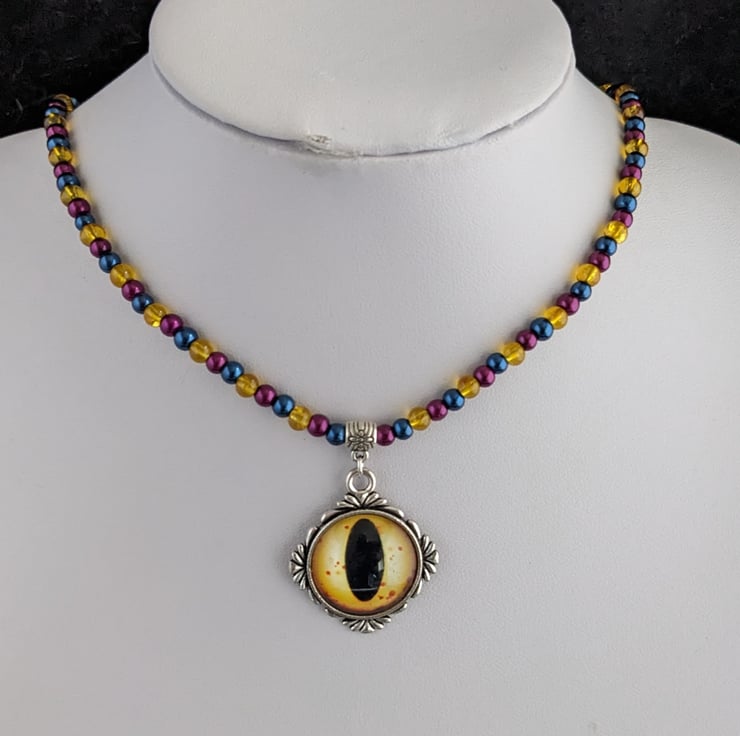 16" handmade necklace of 4mm glass beads in dark blue, magenta and yellow, with a 20mm yellow dragon eye glass cabochon in a Tibetan silver setting. The necklace also has a 2" extension chain. In an organza gift bag.