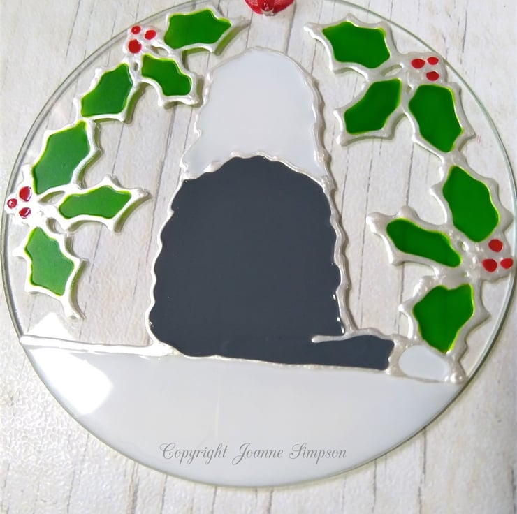 This is a 10cm glass circle. A lovely Old English Sheepdog dog sits in the snow surrounded by Holly. A single name upto ten letters including spaces can be added to the snow, or it can be left blank. Finished with an organza ribbon for hanging. A beautiful addition to any tree or window this Christmas. These decorations make a lovely gift. Old English Sheepdog Christmas decoration. All my sun catchers are individually hand painted so are all completely unique.