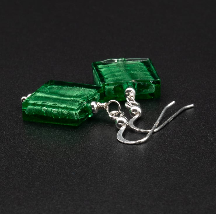 These lovely shimmering beads have a base of gold foil overlaid with shades od aqua blue, lime green and forest green. The squares measure 14mm across and the finished length is 1.5 inches / 38mm. Ear wires are sterling silver hooks.