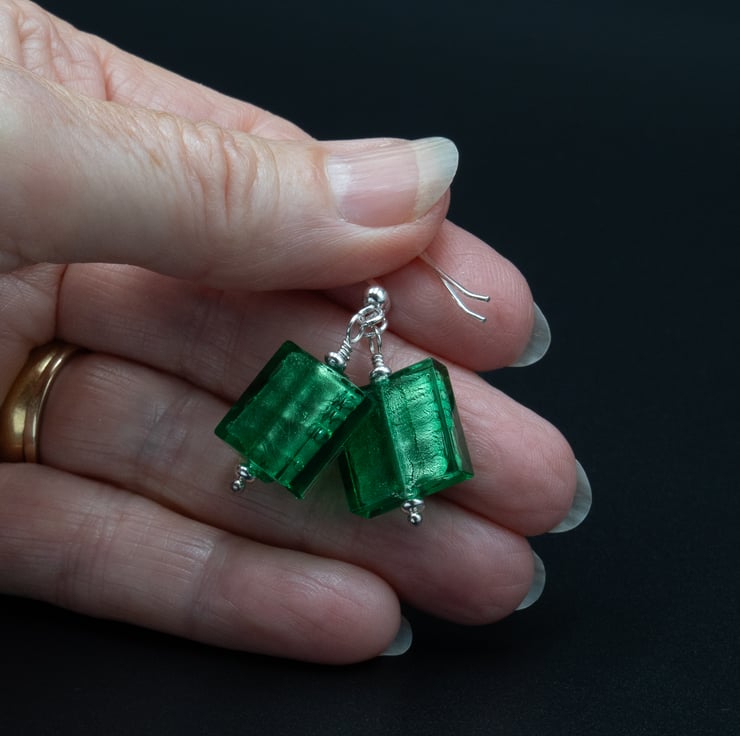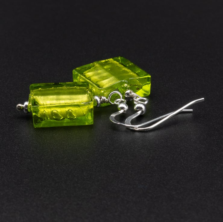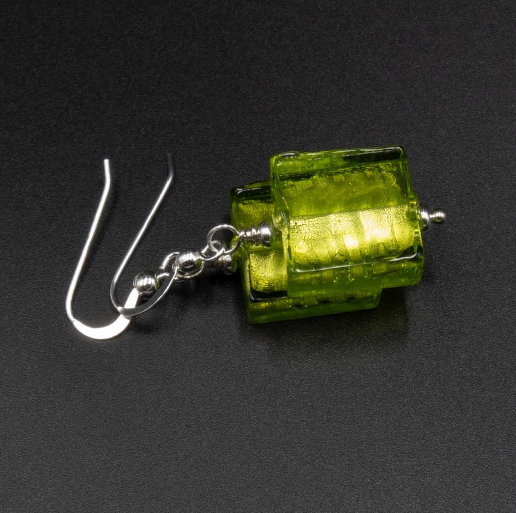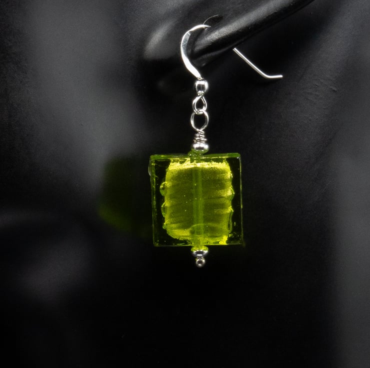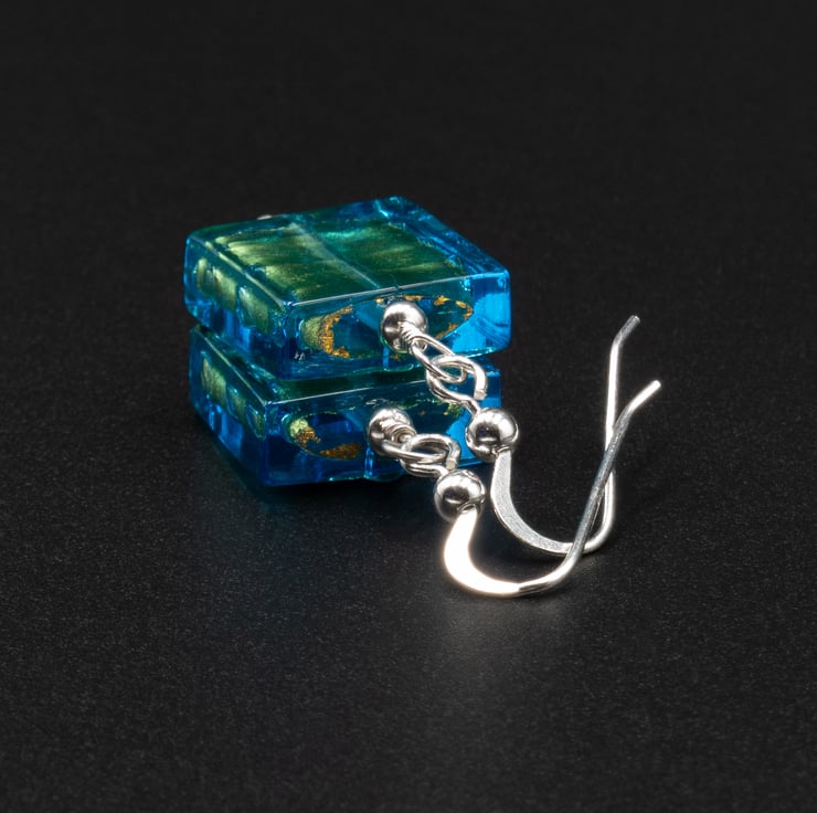 These lovely shimmering beads have a base of gold foil overlaid with shades od aqua blue, lime green and forest green. The squares measure 14mm across and the finished length is 1.5 inches / 38mm. Ear wires are sterling silver hooks.