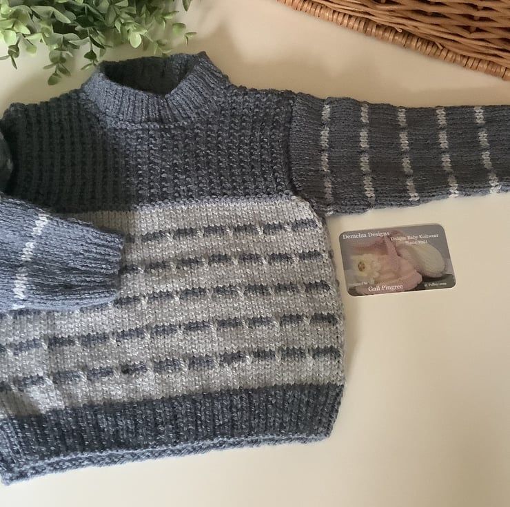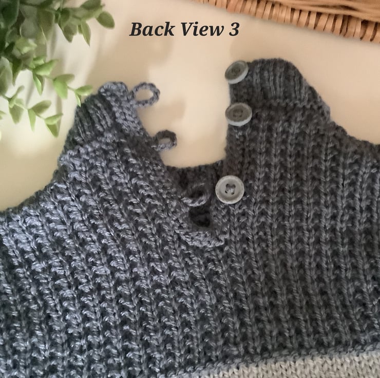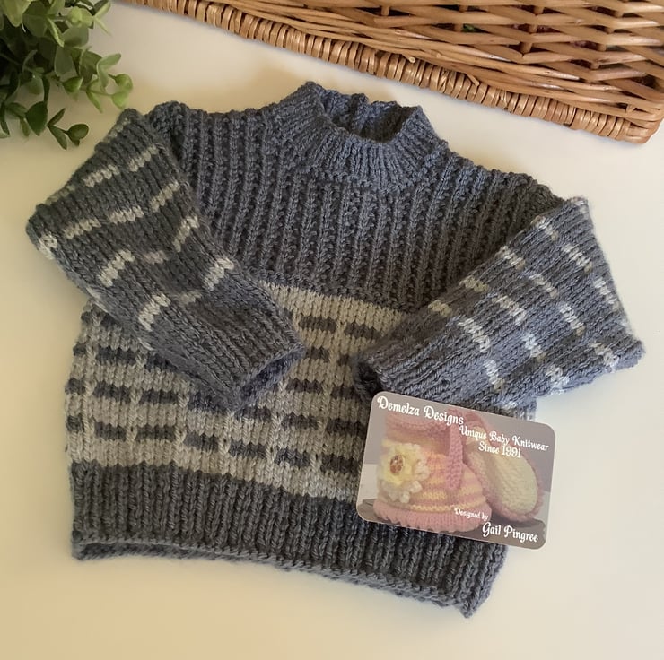 A lovely baby boy's jumper designed and hand crafted using quality branded machine washable yarns. The jumper has a back opening with 3 buttons and loops for ease getting the garment on and off over the head. The branded Demelza Designs garment label is attached to the back opening side with the care instructions woven within it for lasting reference. A Demelza Designs garment swing tag will be attached to the front prior to dispatch for a professional touch if gifting.