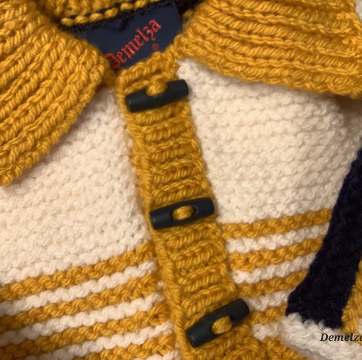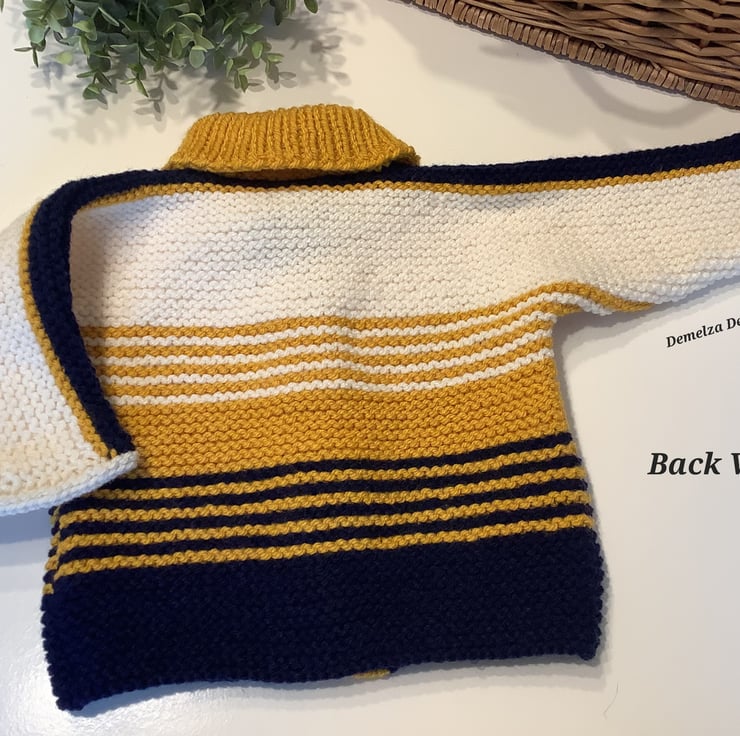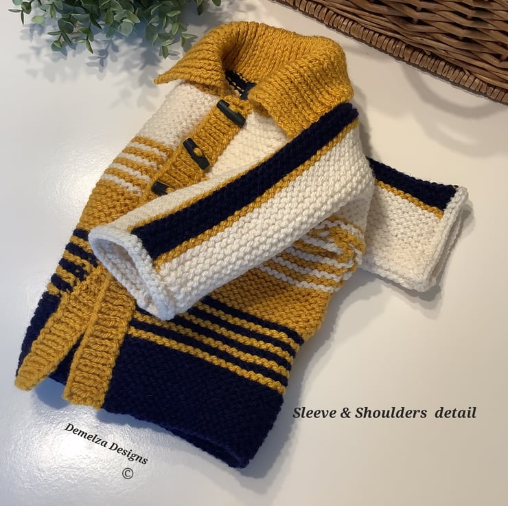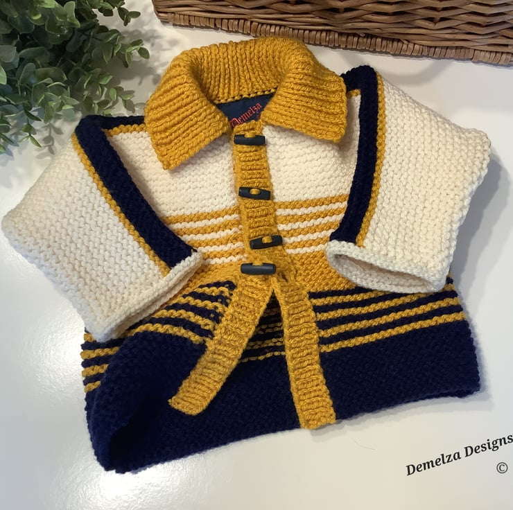 A wonderful designer baby boy's aran jacket made in Cornwallwill be ideal for wearing whilst out and about in the buggy/car when an outer thick coat/all in one suite is not required. I have designed the garment and hand knitted it using quality branded British manufactured premium soft machine washable aran weight yarns. The jacket buttons are toggle design in navy blue. On the jacket back neck edge the branded Demelza Designs garment label has been attached with the care instructions woven within it on the reverse side for lasting reference. A Demelza Designs garment swing tag will be attached prior to dispatch for a professional finish if gifting and proof of it's origins.