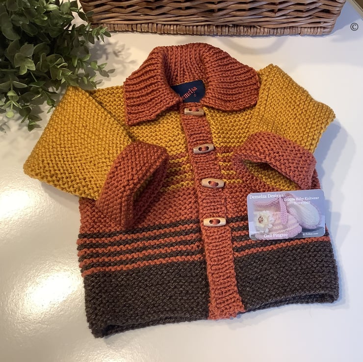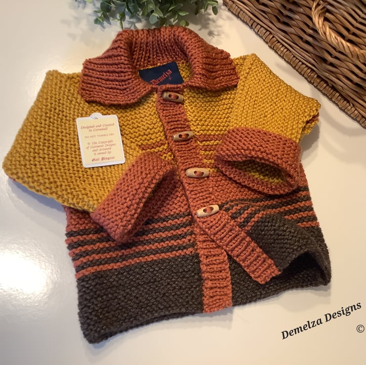 A wonderful designer baby boy's aran jacket ideal for wearing whilst out and about in the buggy/car when an outer thick coat/all in one suite is not required. I have designed the garment and hand knitted the item using quality branded premium soft machine washable aran weight yarns. The jacket buttons are hand made from genuine wood. On the jacket back neck edge the branded Demelza Designs garment label has been attached with the care instructions woven within it on the reverse side for lasting reference. A Demelza Designs garment swing tag will be attached prior to dispatch for a professional finish if gifting and proof of it's origins.