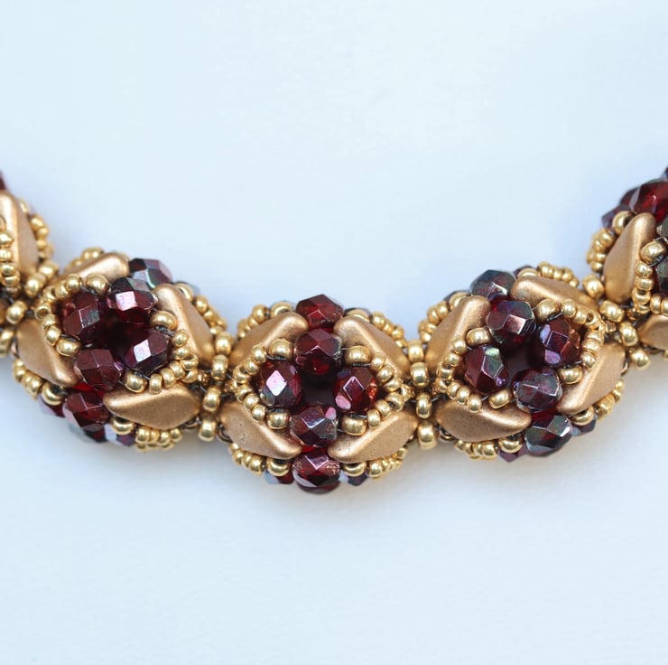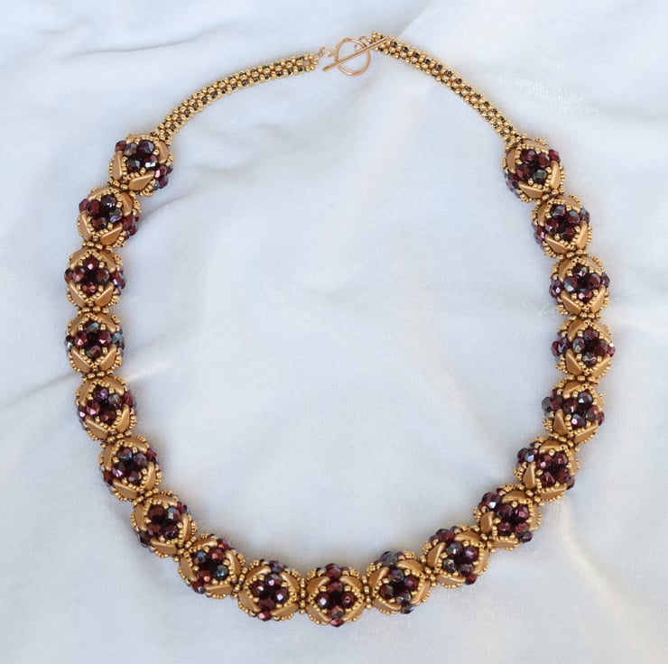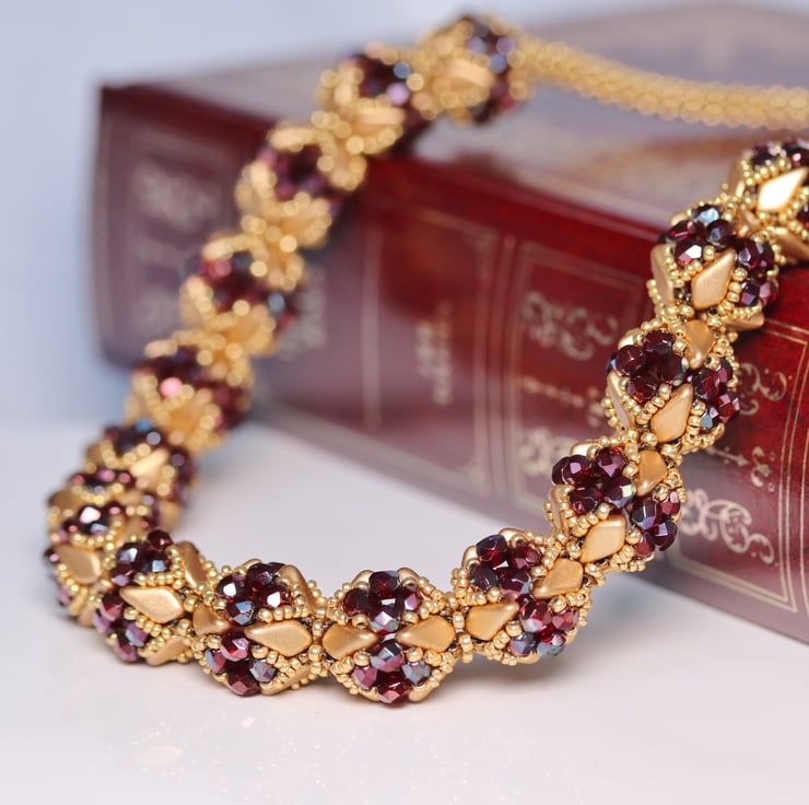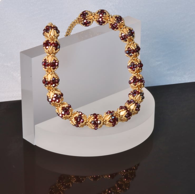 This striking beadwoven necklace consists of a continuous chain of 19 beaded beads made from pretty kite beads in a beautiful antique matt gold colour, and from deep red 4mm firepolished beads with an AB (aurora borealis) coating to help them catch the light. Tiny gold coloured seed beads complete the piece, which has a gold-filled (also known as rolled gold) toggle clasp for ease of fastening. Gold-filled components have a thicker gold coating than gold plated making the gold layer more durable; less likely to wear away.