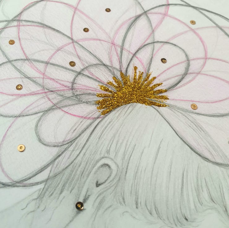 I have created this drawing on Daler Rowney Hot Pressed Watercolour Paper. I have used Faber Castell Graphite Pencils, Faber Castell Polychromos Pencils, Gold Sequins, and fine Gold Glitter. This drawing is sold unframed.