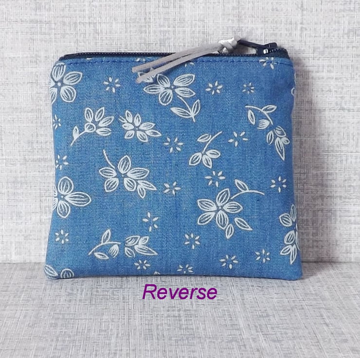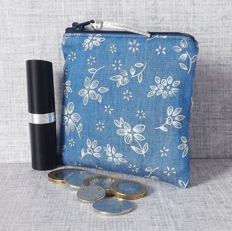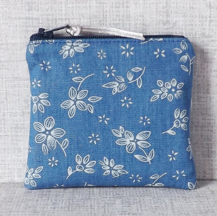 A small coin purse made from lightweight denim fabric with a white floral design.