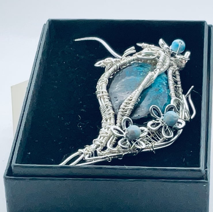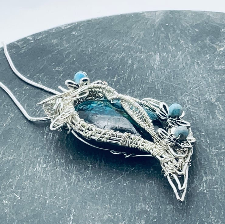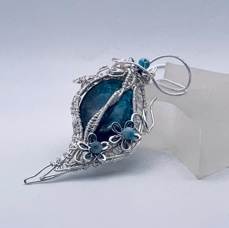 This mottled blue gemstone is brought to life by the flowers that adorn the silver wire wrapping of the cabochon stone. As a gift for a lady who loves blue, it is a sheer delight. It may be worn for any time of day from smart daytime to late in the evening. The outdoor theme makes it perfect for summer wear, especially for the summer holidays when we all spend more time out of doors. It measures 45 x 50 mm, so a little on the large side! Which is fine when the wearer wishes to make a statement about their appearance! It hangs on a snake chain 600 mm long. If you prefer a different length! Just say so!. It will be changed! Nothing is too much trouble!