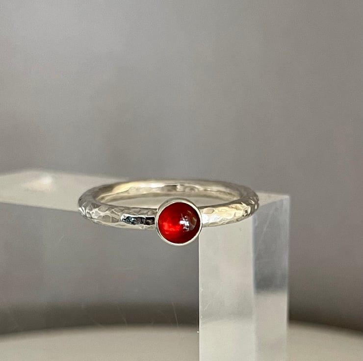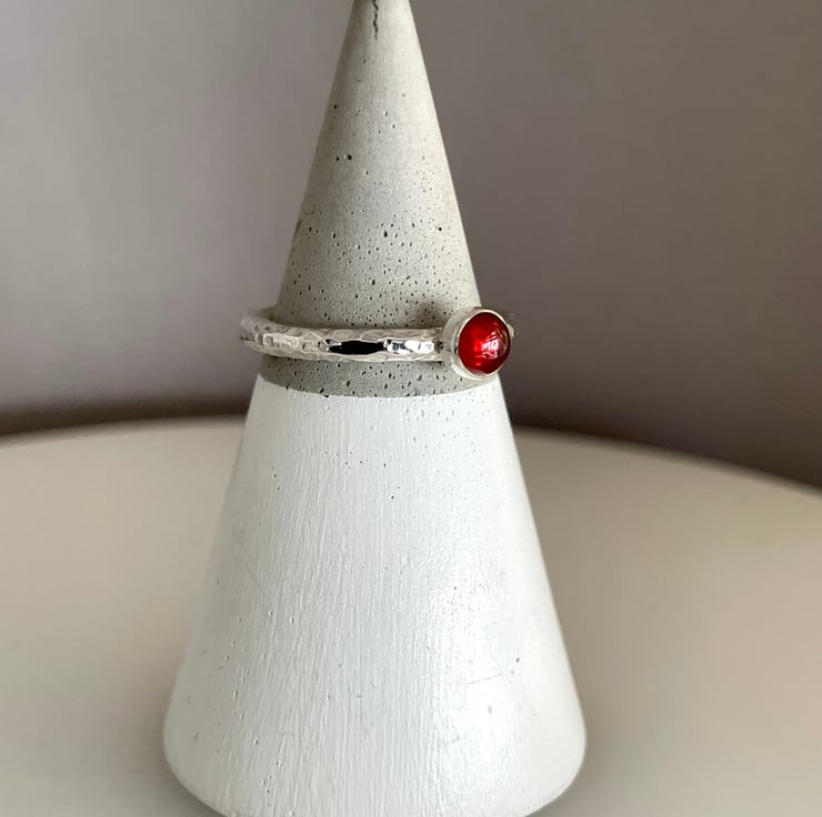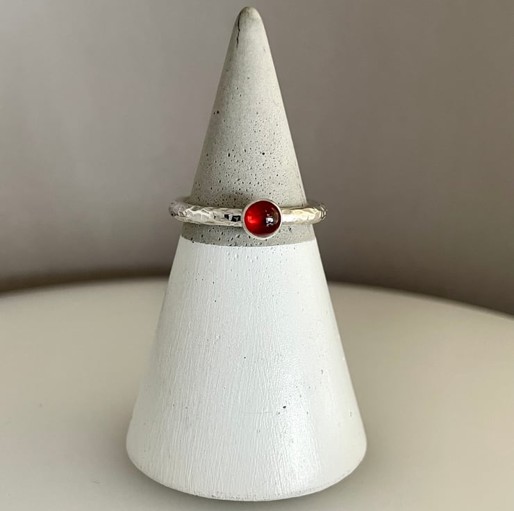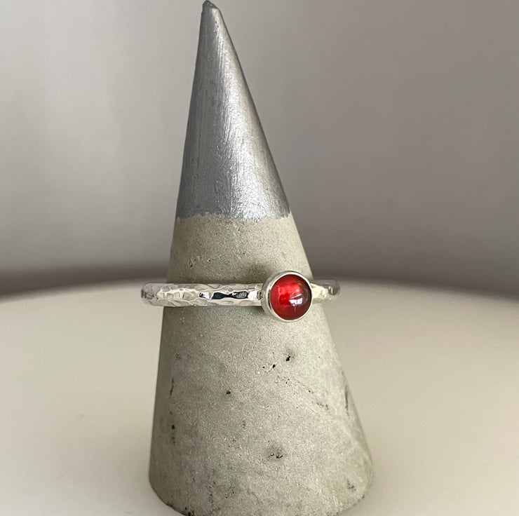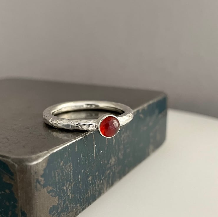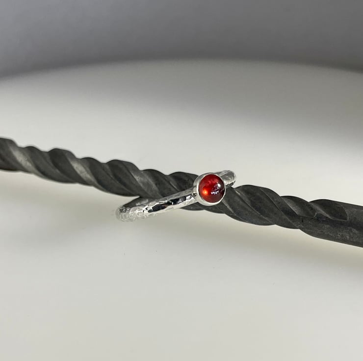 A beautiful ring handmade from solid 2.5mm thick Sterling Silver round wire, hammered to create it’s unique sparkly textured surface and set with an attractive deep red Garnet cabochon gemstone.