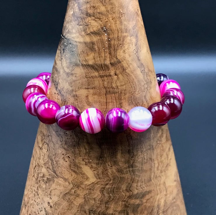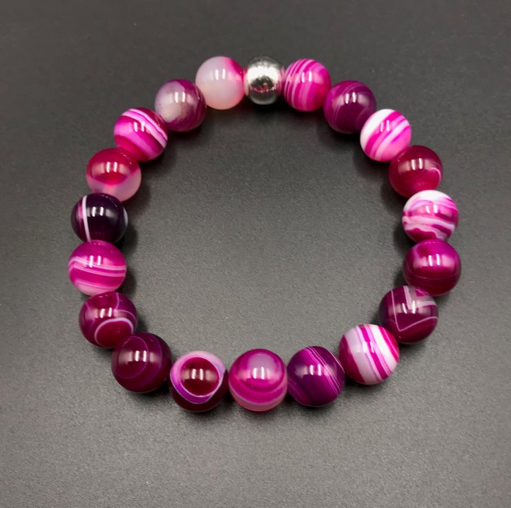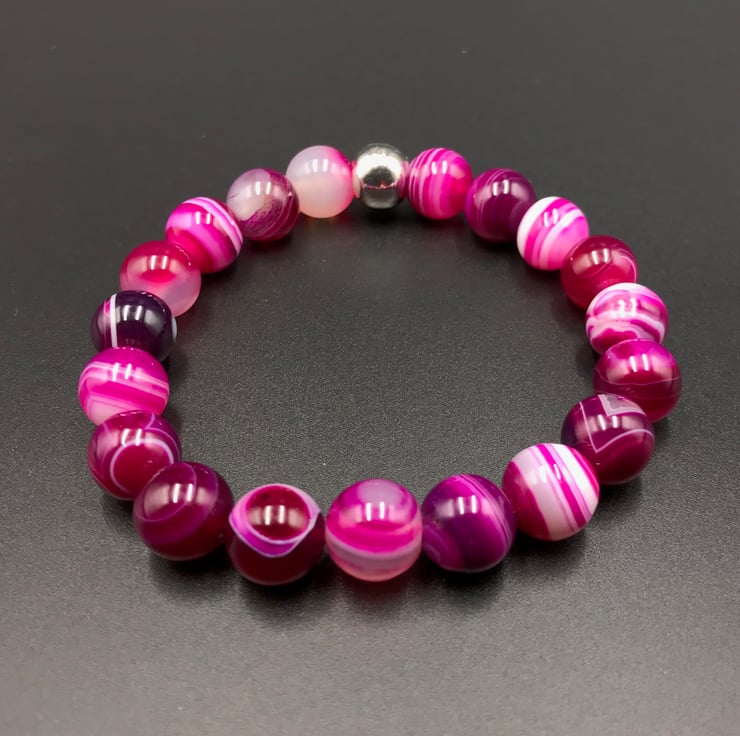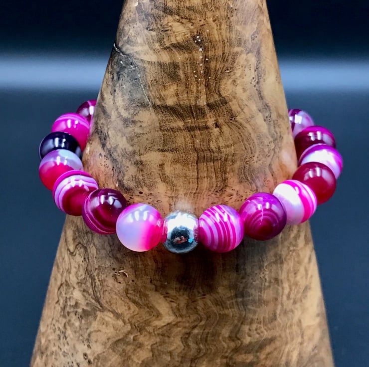 10mm rounds of lovely striped cerise pink agate are accented with a ceramic silver plated 10mm bead. The beads are strung onto a strong elasticated thread to allow the bracelet to roll on and off the wrist without the need for a fiddly clasp.