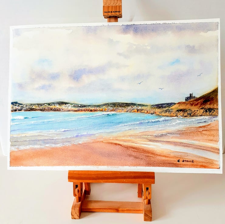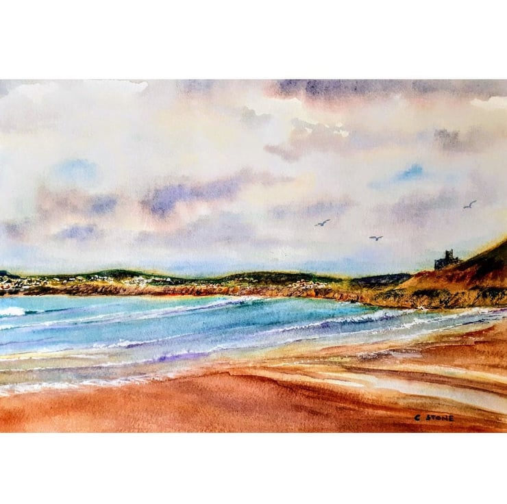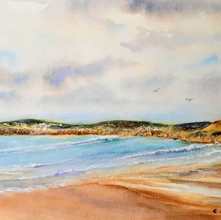 An original watercolour painting of one of my favourite beaches at Perranuthnoe, near Penzance in the far west of Cornwall. From my own sketches and photographs, the view looks beyond the rocks at Perranuthnoe towards St. Michael's Mount, just visible in the painting. Further in the distance are Penzance, Newlyn. and the rugged hills of the Penwith Peninsula.