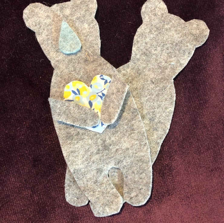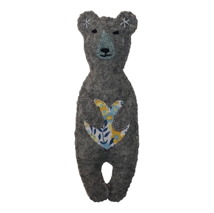 I do not use kits – every’ make’ I create, begins as a picture inside my head and I make up the design of the colours and embroidery as I go along. As such, every make is totally unique and I can guarantee that no one else will have one the same. The bear's love heart is made from Liberty 'Wiltshire Funshine' and I have used over stitch to complete the bear.