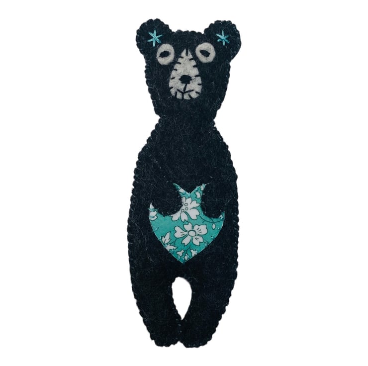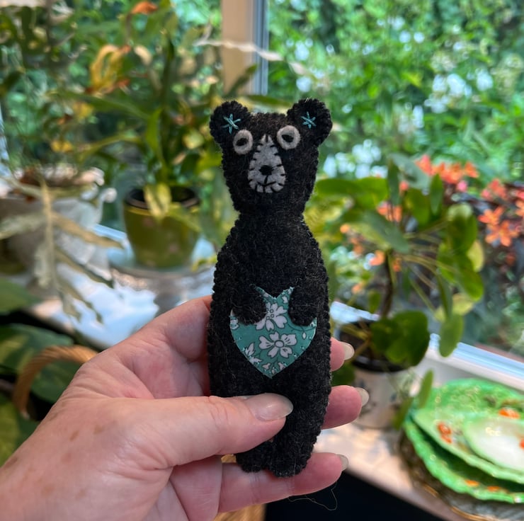 This bear is made from dark grey wool felt and carries a love heart made from Liberty 'Capel Mint'. I have used over stitch to complete it.