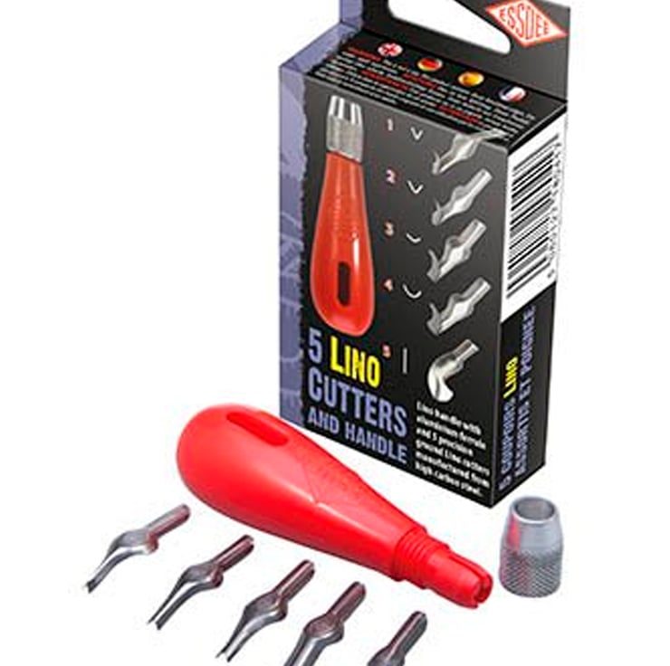 Plus one Essdee lino cutter set, 5 precision ground lino cutter blades manufactured from high-carbon steel together with a sturdy polypropylene handle and aluminium ferrule which allows easy fitting and tightening of the cutters.